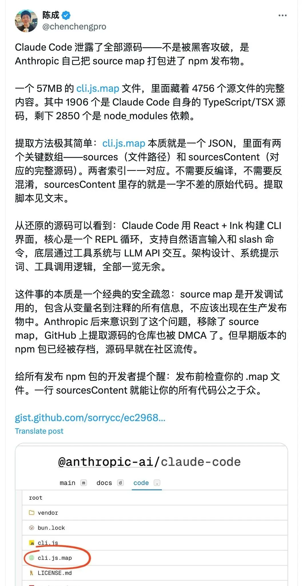 事情的技术细节并不复杂。Anthropic 在发布 @anthropic-ai/claude-code v2.1.88 版本时,未在 .npmignore 中过滤掉 source map 文件。一个 59.8MB 的 .map 文件被直接打包进了 npm 发布物,其中包含 4756 个源文件的完整内容。
