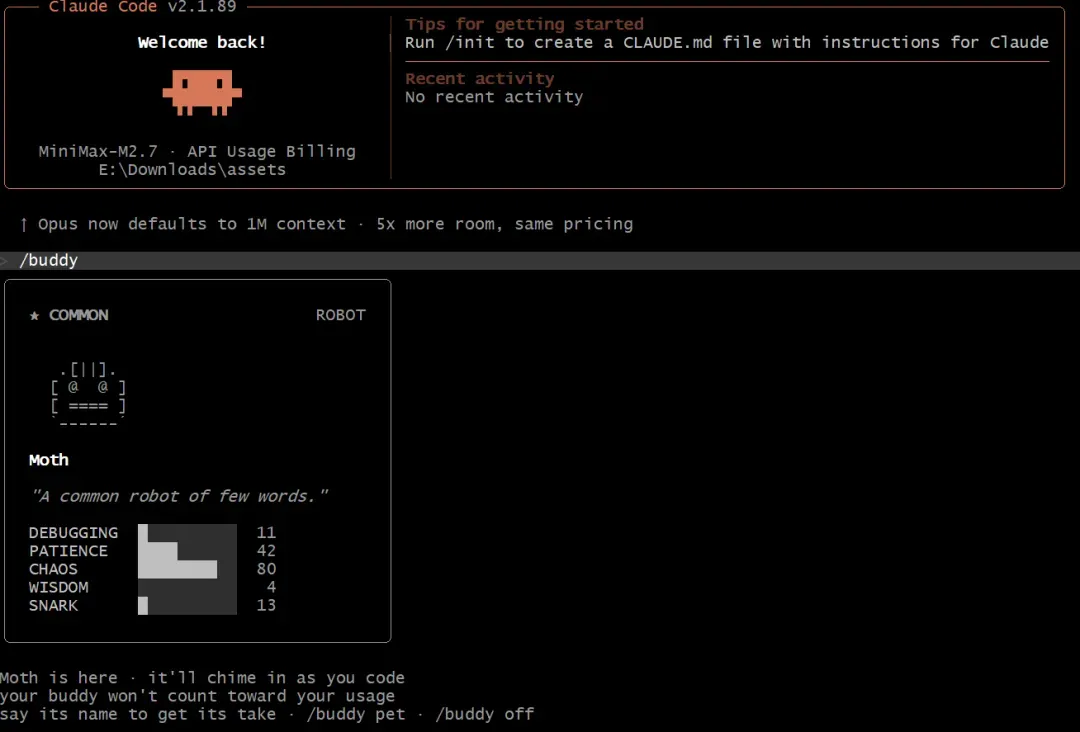 值得注意的是,刚刚更新的 Claude Code v2.1.89 已经上线了 Buddy,用户更新后只需输入 /buddy 即可启用 —— 即使配置了其它模型也可成功启用。比如这里我们配置了 MiniMax-M2.7 的 Claude Code 便认领了一个名为 Moth 的 Buddy。