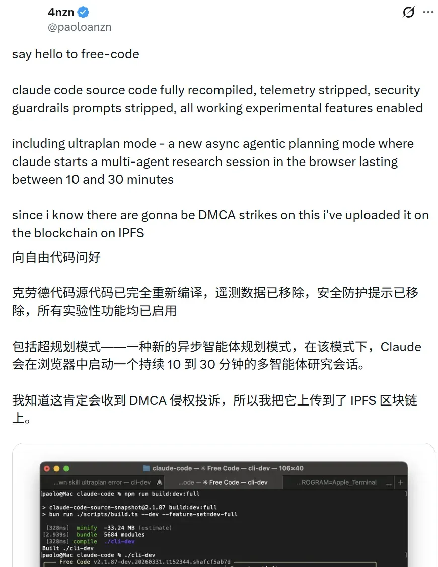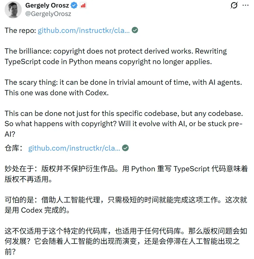 对此,《The Pragmatic Engineer》的创始人 Gergely Orosz 在 X 上的一篇帖子中指出:这要么很绝妙,要么很可怕: Anthropic 意外泄露了 Claude Code 的 TS 源代码。共享源代码的仓库被 DMCA 下架。但是这个仓库使用 Python 重写了代码,因此它没有侵犯版权,并且无法被下架,让 DMCA 有力也无处使!