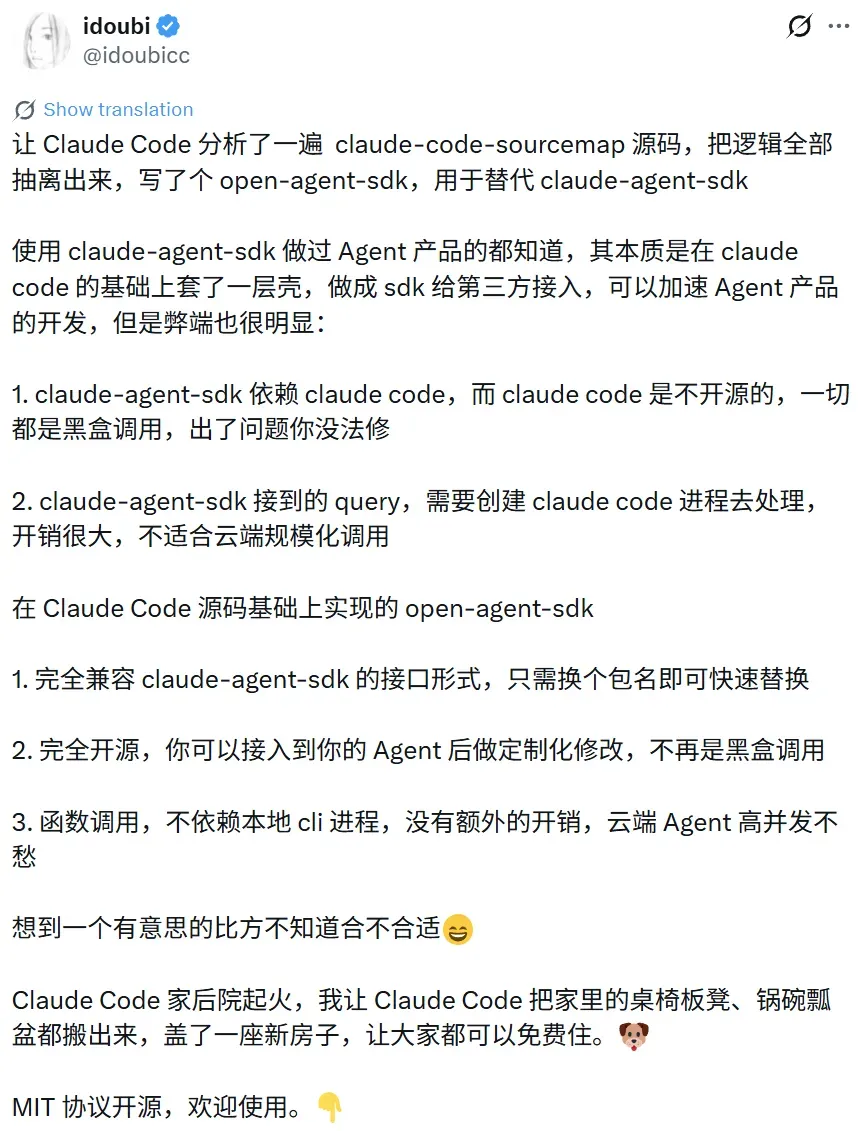 改进也正在进行时……X 用户 idoubi「让 Claude Code 分析了一遍 claude-code-sourcemap 源码,把逻辑全部抽离出来,写了个 open-agent-sdk,用于替代 claude-agent-sdk」,解决了 claude-agent-sdk 不适合云端规模化调用的问题。