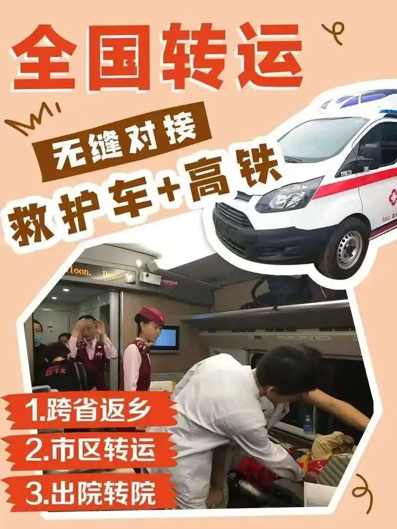 中福救护车出租转运公司,120非急救救护车接送病人预约护送。24小时为术后康复、危重患者及跨区域就医人群提供专业医疗转运服务,提供120救护车出租‖救护车转运‖私人120救护车(非急救)‖跨省长途转运‖危重病人转运‖市内转运‖术后康复病人转运‖高铁病人转运‖患者返乡‖大型活动赛事保障‖配备ICU设备:呼吸机▪心电监护仪▪吸痰器•微量泵•氧气▪急救药箱▪专业医护团队;就近派车
