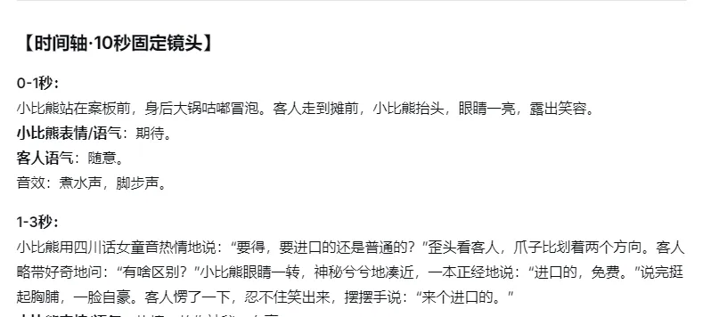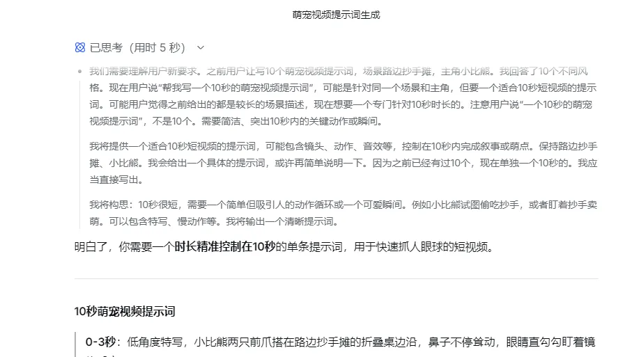 几秒钟它就给你一段完整的提示词,场景、动作、细节都有,你自己都想不到那么细。