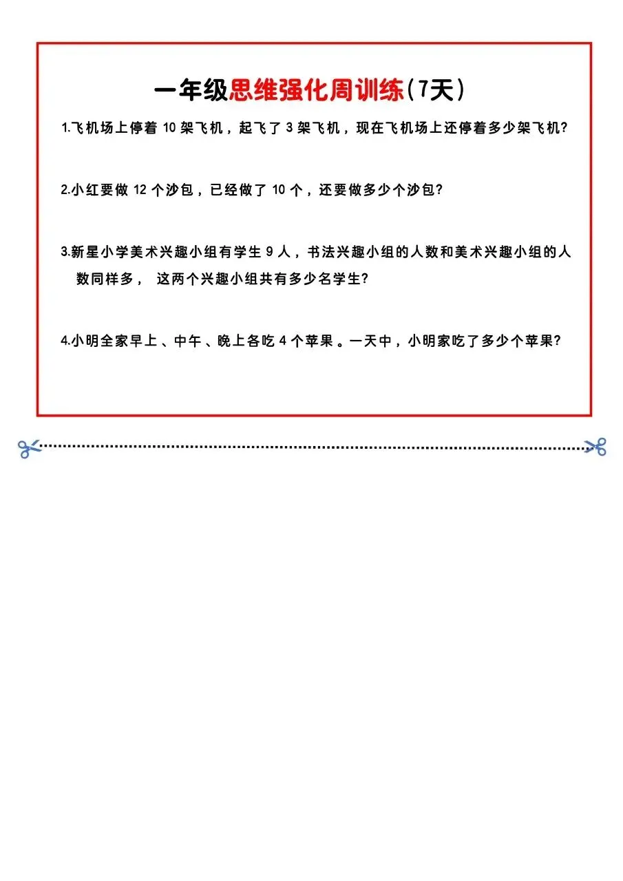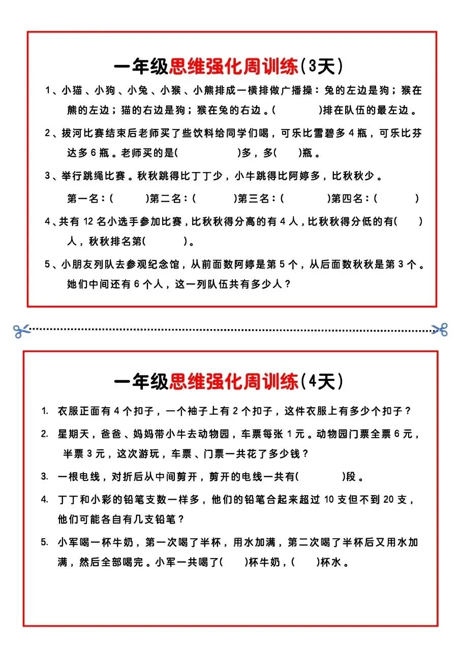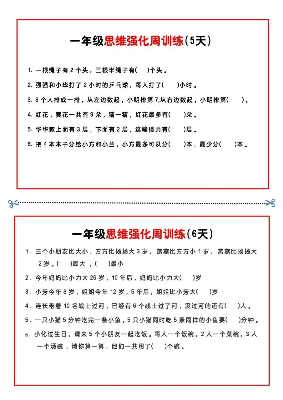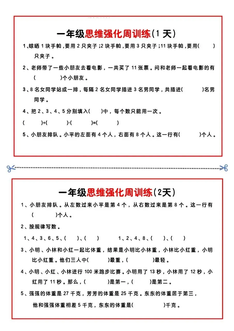 一年级思维题周训练小纸条电子版免费下载!