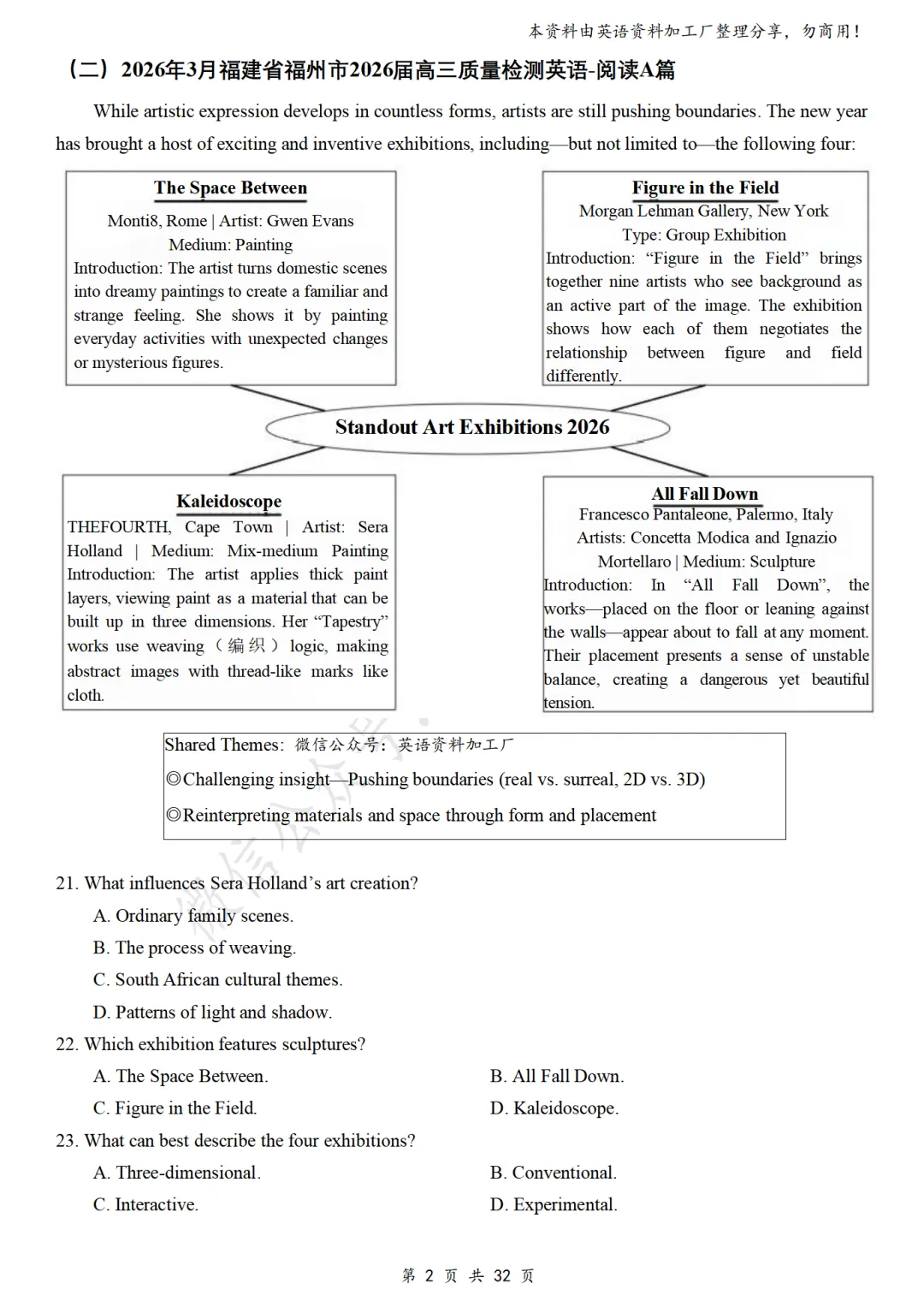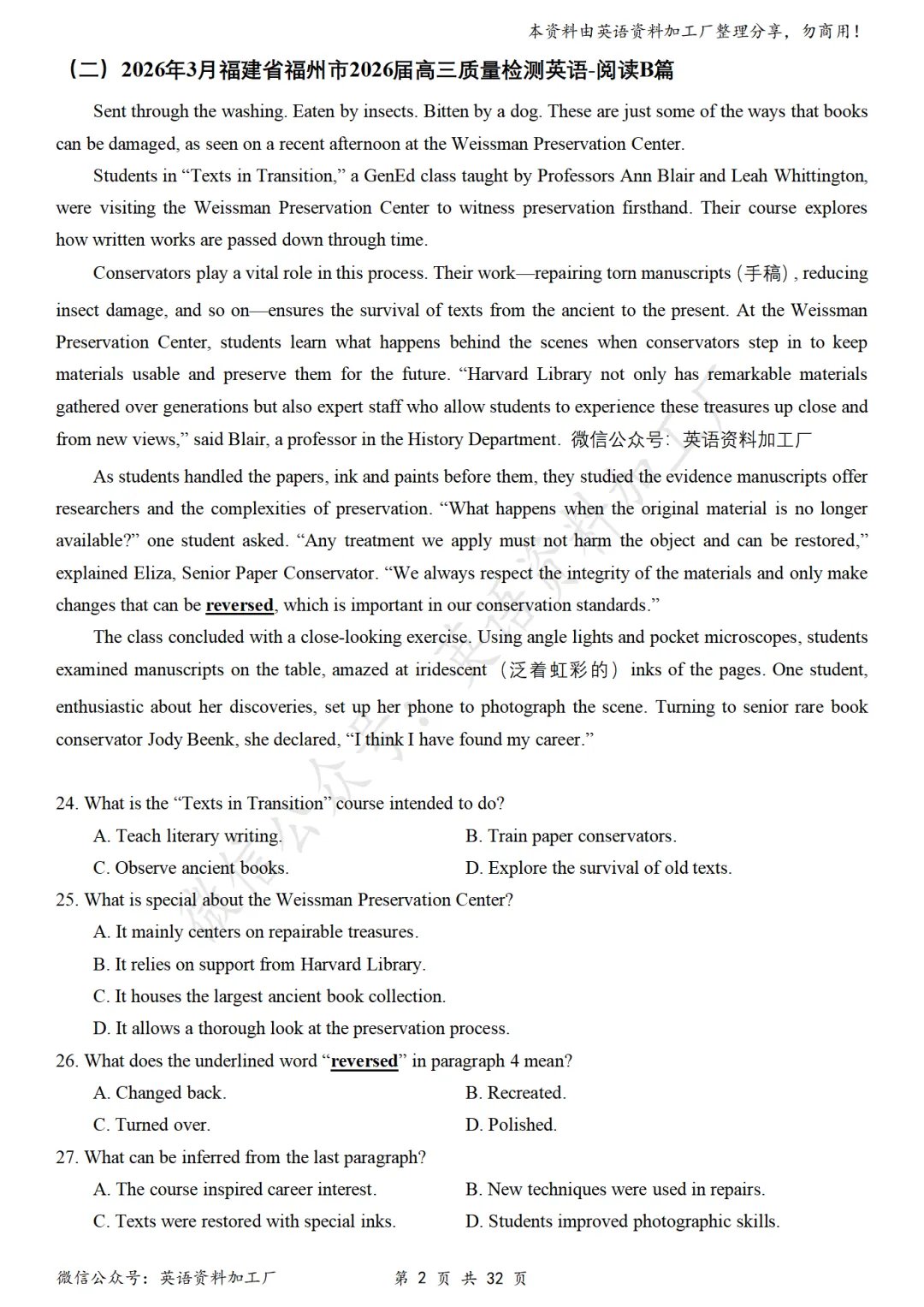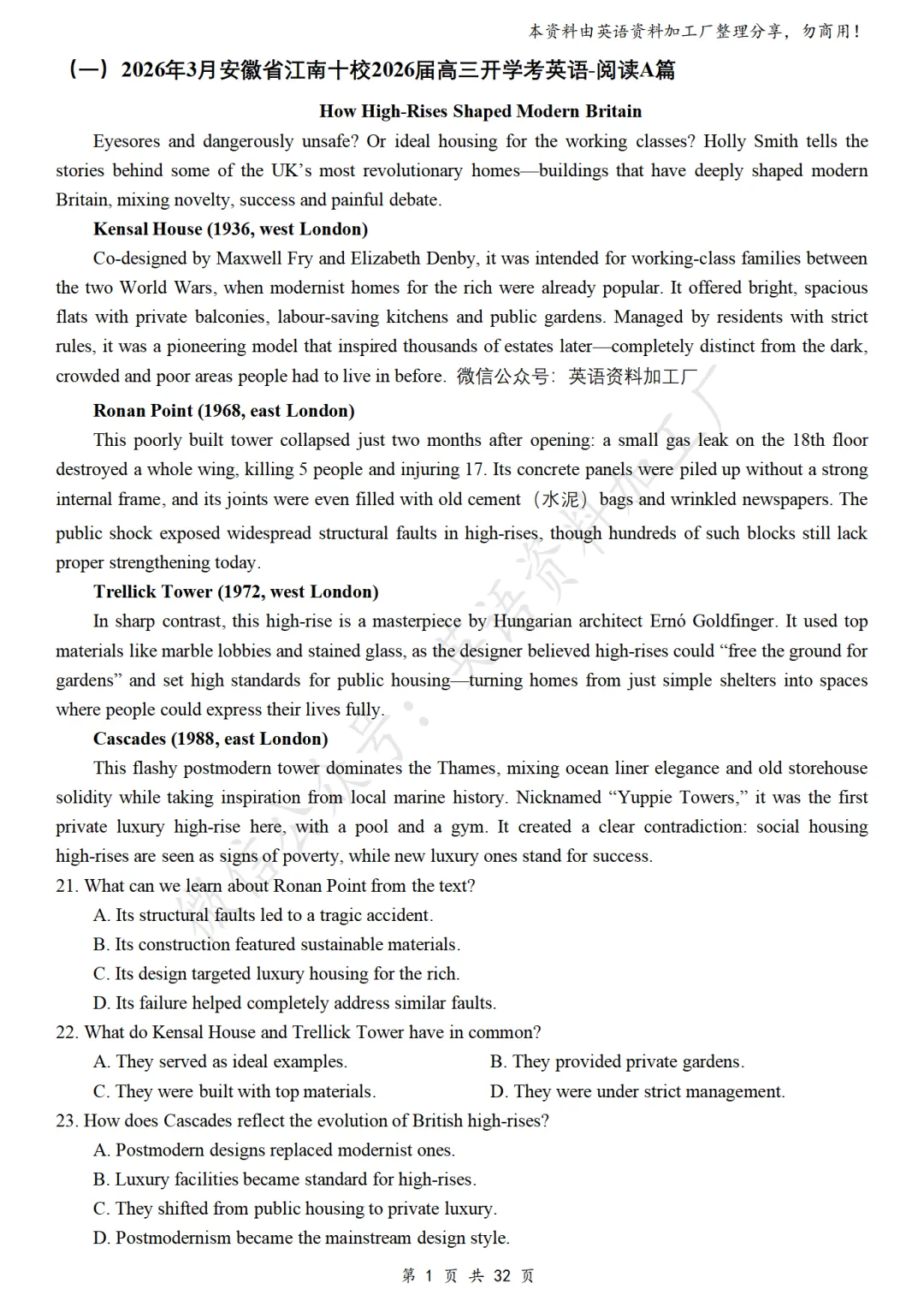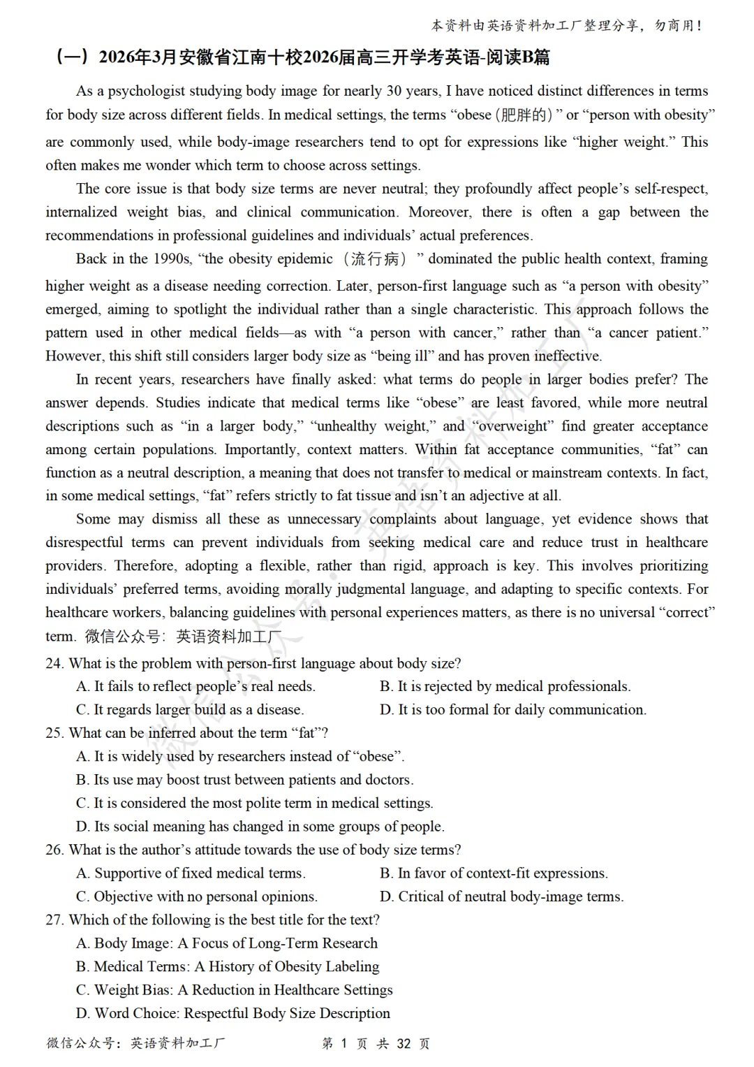 【阅读CD】免费下载!26年3月各地高三联考/模拟考英语阅读C篇、D篇各32篇合集,含答案解析