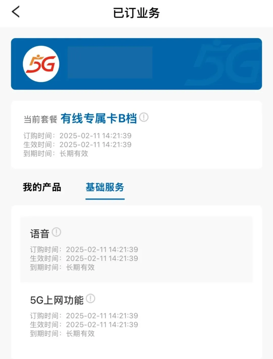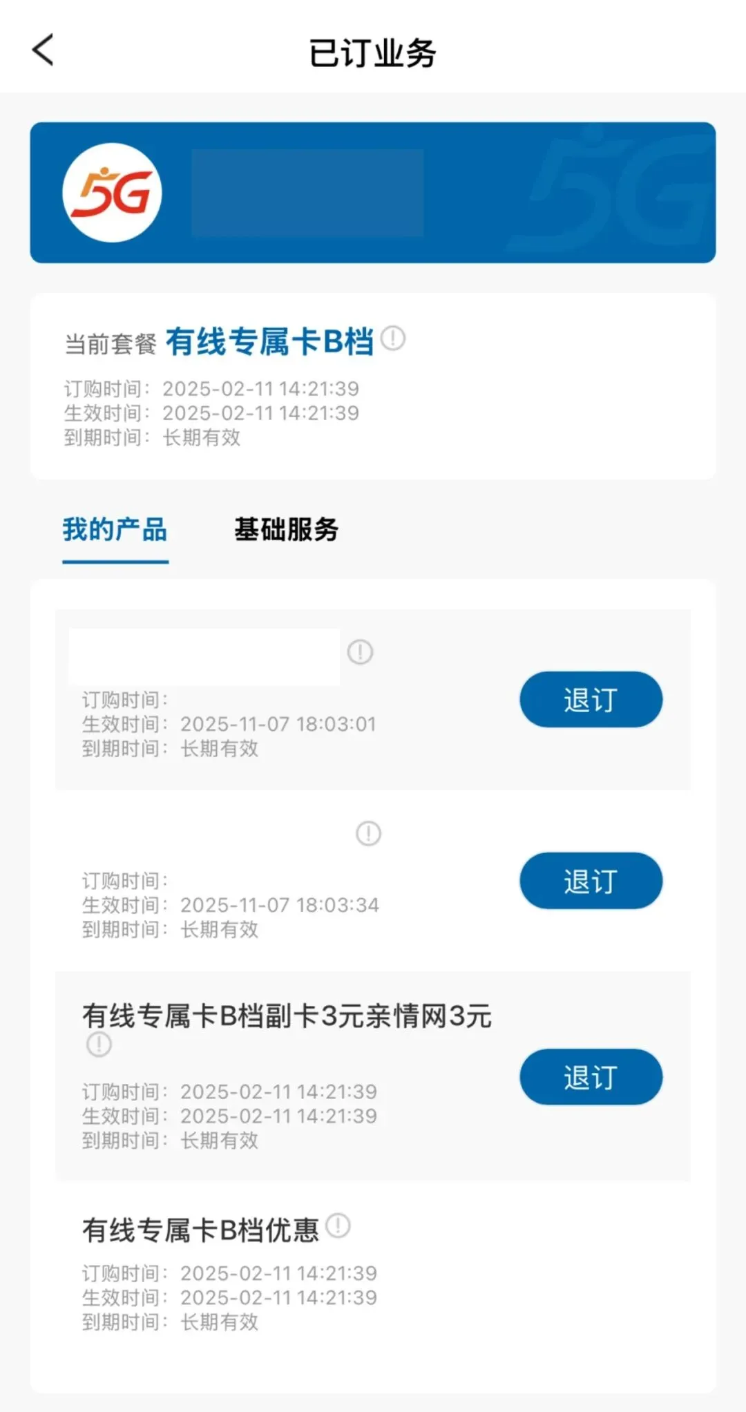 进入【已订业务】页面后,你的当前套餐名称、所有已订业务列表都会清晰展示,页面还贴心分为 【我的产品】【基础功能】两大板块,不同类型的业务分门别类,再也不用在一堆信息里翻找。