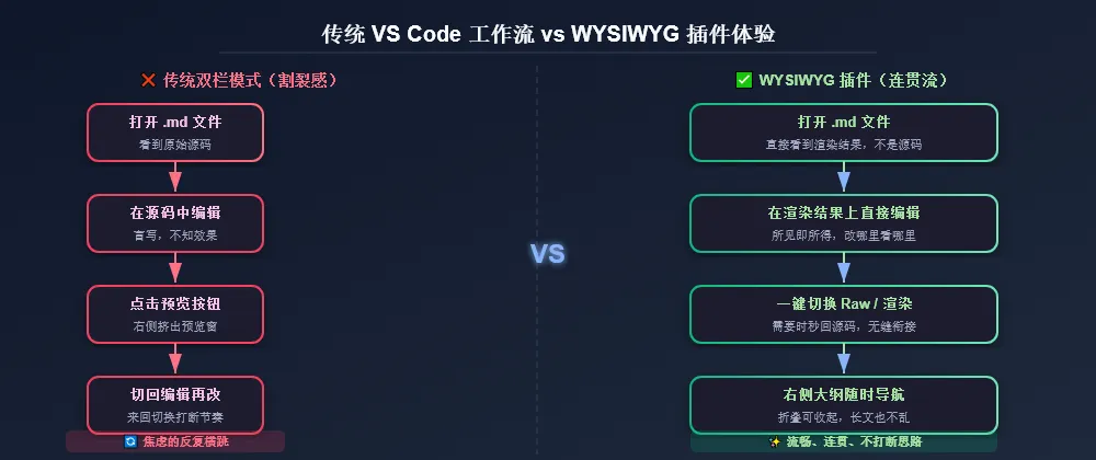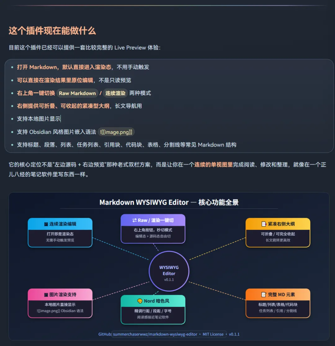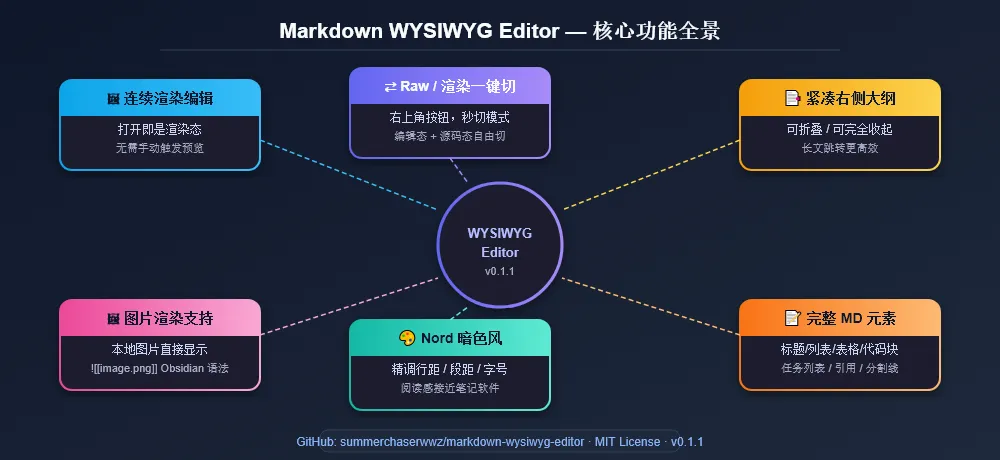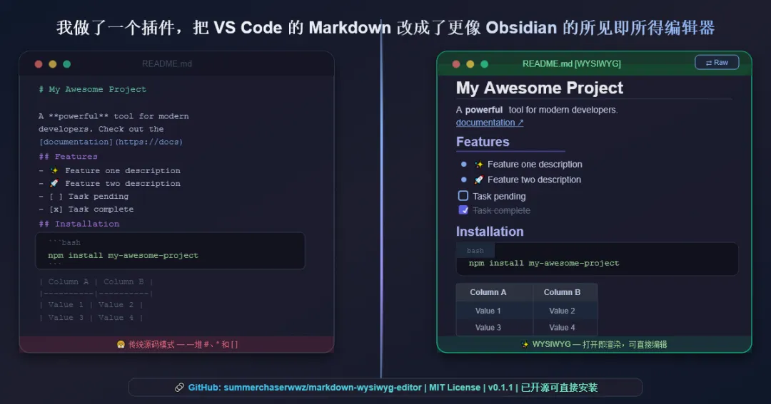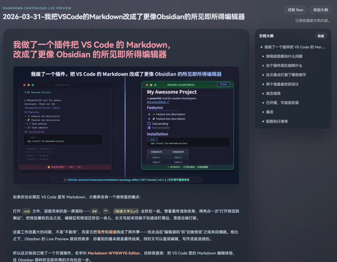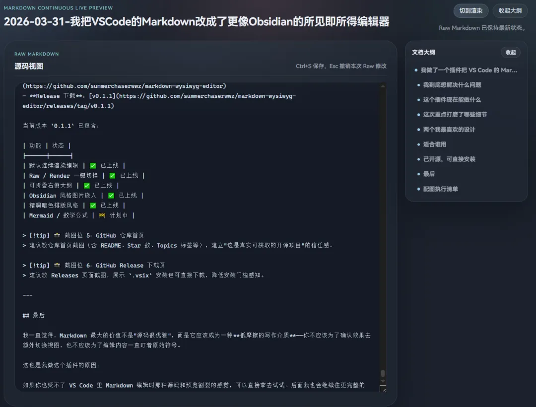 如果你也受不了 VS Code 里 Markdown 编辑时那种源码和预览割裂的感觉,可以直接拿去试试。后面我也会继续往更完整的 Obsidian 风格体验上打磨——更强的语法支持、更自然的连续编辑、更稳定的渲染细节。