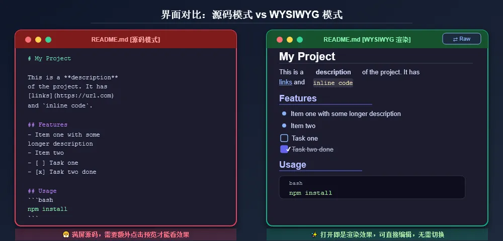 我一直觉得,Markdown 最大的价值不是”源码很优雅”,而是它应该成为一种低摩擦的写作介质——你不应该为了确认效果去额外切换视图,也不应该为了编辑内容一直盯着原始符号。