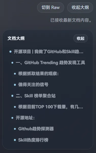 右侧提供可折叠、可收起的紧凑型大纲,长文导航用 -