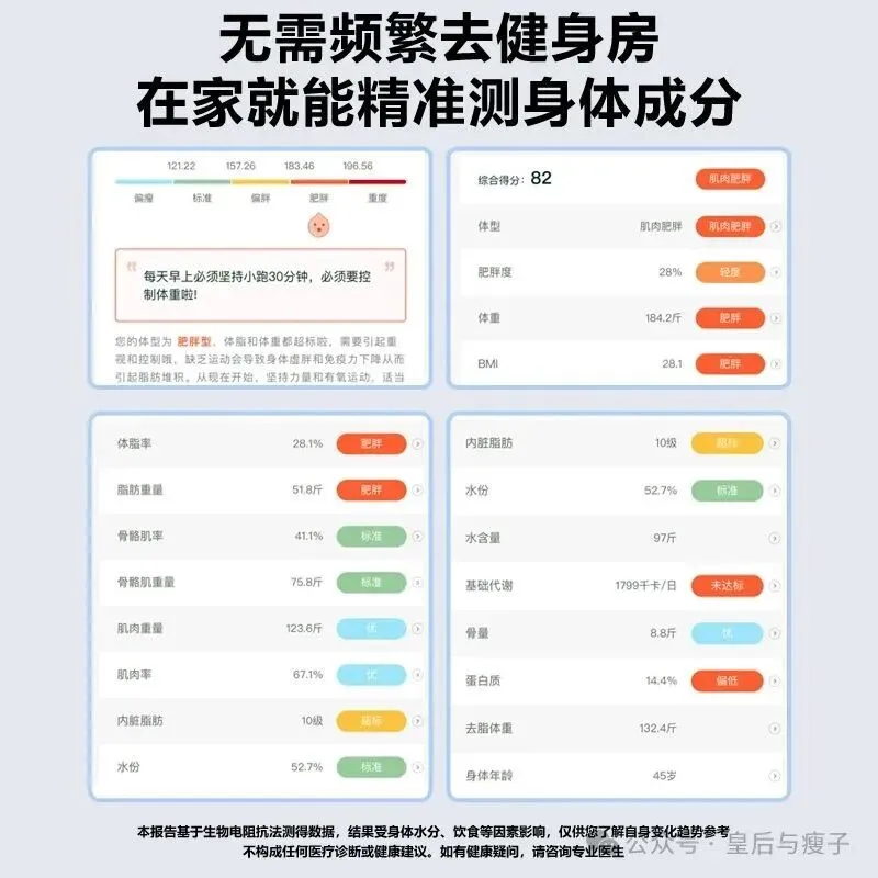 如果家里有体脂秤,那它给出的数据会是“变瘦但体重不变”的精准佐证。比起普通体重秤只显示体重,体脂秤能直观反映体脂率、肌肉量、水分率等关键指标。