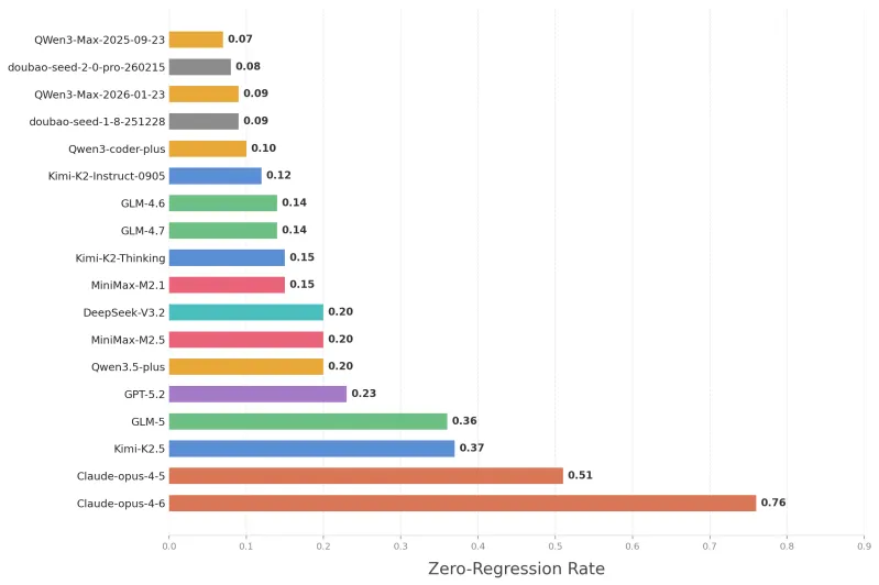 结果很残酷:大多数模型在超过75%的任务上都会引入回归。什么叫回归?就是你修了新bug,结果把之前已经通过的测试搞挂了。