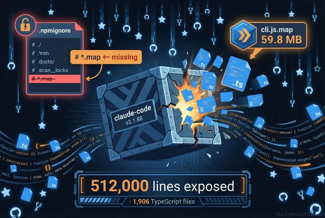 2026 年 3 月 31 日,Claude Code 发布了 v2.1.88。 按照 Claude Code 的发布节奏,这本来是一件很平常的事情。只不过这次有点特殊,工程师在.npmignore里漏掉了*.map这条规则。导致一个59.8MB 的cli.js.map随包进了 npm。这个文件里有个指针,直接指向 Anthropic R2 存储上完整源码的 zip。