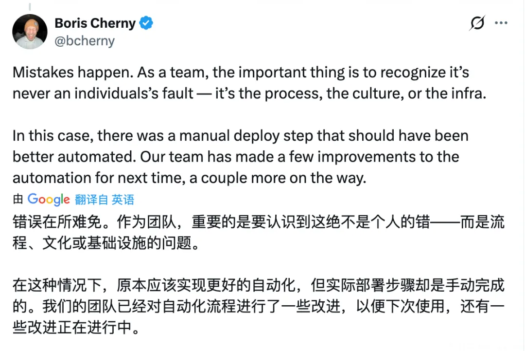 网上有分析把根因归到 Bun 的 bug。不过 ,Claude Code 项目开发负责人 Boris Cherny 否认了这个说法,只是一个工程师的失误以及流程问题。一个本该自动化的发布步骤,还在手动执行。