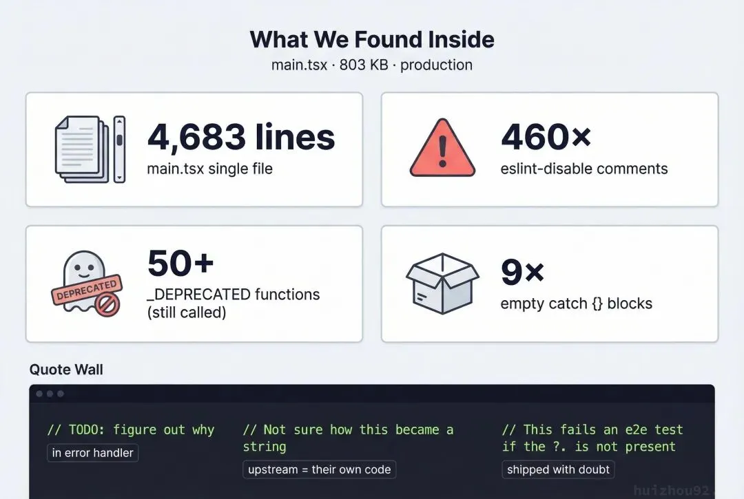 main.tsx单文件4683 行,803KB。全局460 个eslint-disable注释。有人评论说”这不是 TypeScript,是带冗余步骤的 JavaScript”。50 多个带_DEPRECATED后缀的函数还在生产环境被调用,比如: