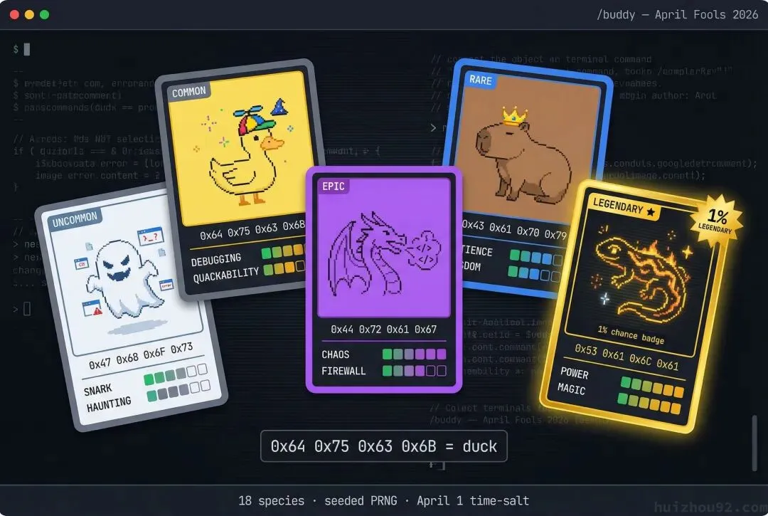 /buddy命令,18 个物种:鸭子、水豚、龙、幽灵、蝾螈,还有 “chonk”。完整的抽卡稀有度,1% 传奇概率,闪亮变体,帽子装饰(皇冠、法师帽、螺旋桨、小鸭帽)。