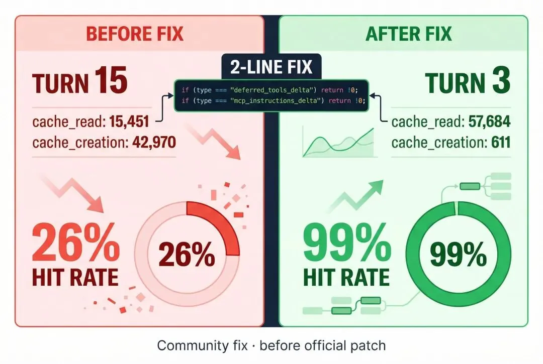 Reddit 上有个老哥拿到泄露的代码,用 Codex 找到了根因:db8函数在恢复会话(claude –resume)时,会把所有deferred_tools_delta类型的附件过滤掉了。这些附件记录 “我已经向模型注册过哪些工具”。 如果这些记录没了,每次恢复会话都重新注册所有工具,破坏提示词缓存的前缀。会话越长,浪费越多。因为token命中缓存与没有命中缓存的价格差了十倍。老哥改了两行代码,就修复了这个问题