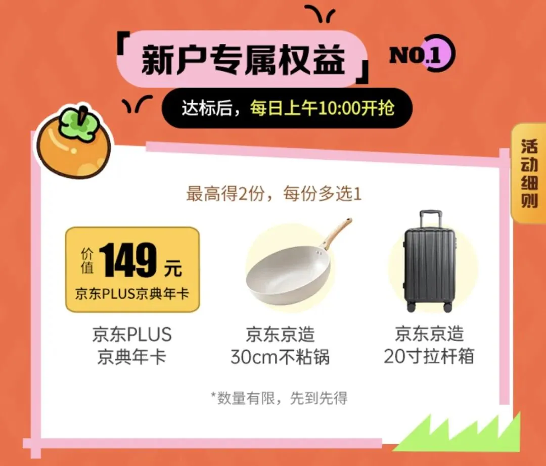 权益1:卡片激活30天内,用京东支付(plus卡绑定京东APP内的京东钱包,并通过京东支付)任意消费3天且累计消费金额满199元,可领取一份新户好礼3选1(京东PLUS京典年卡/京东京造20寸拉杆箱/京东京造不粘锅);