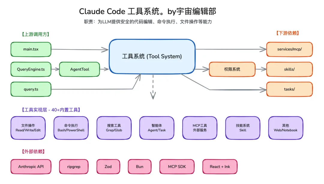 打开 src/tools/ 目录,我数了一下,40 多个工具的实现:从基础的文件操作到复杂的 Agent 创建,覆盖面相当广。BashTool 负责执行 shell 命令,FileEditTool 支持多文件批量编辑,GrepTool 能在海量代码中快速定位目标。