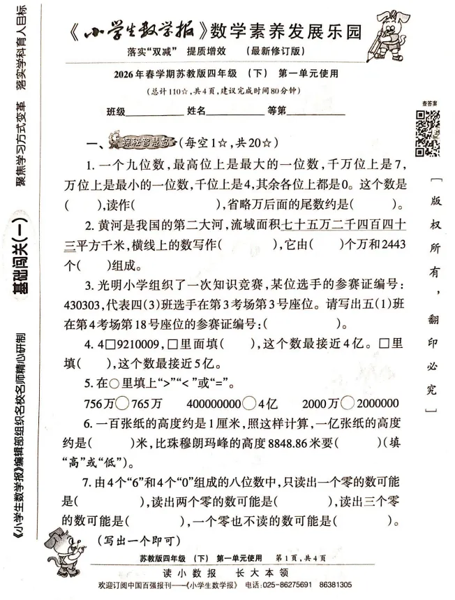 今天给大家分享:2026春江苏省最新版小数报1-6年级电子版 电子版!如果觉得不错的话,可以转发分享到班级群/年级群,让家长打印出来,帮助孩子学习!