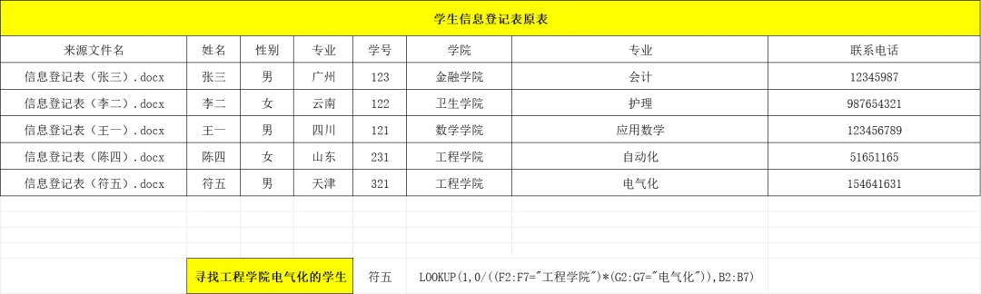 实战代入:=LOOKUP(1,0/((F2:F7=”工程学院”)*(G2:G7=”电气化”)),B2:B7)