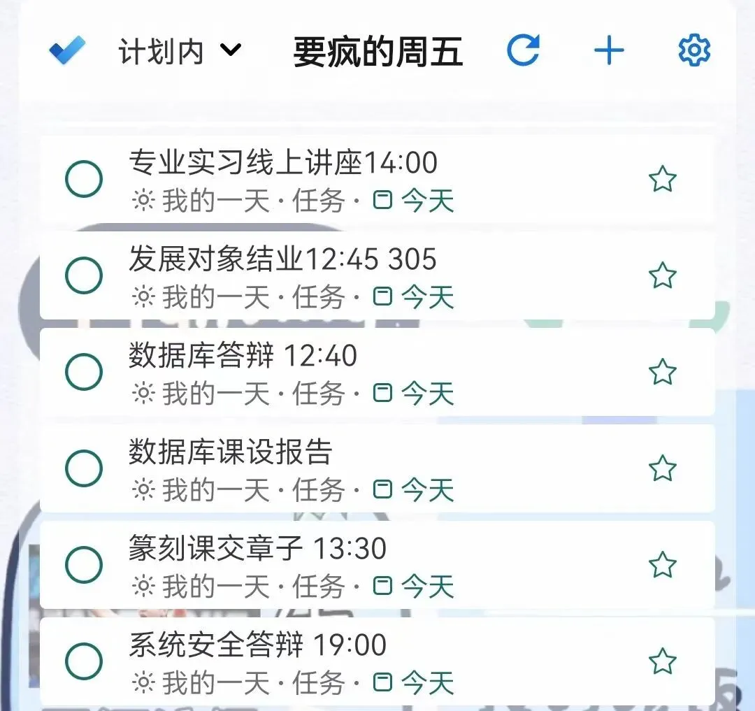 还有一个原因是它可以在桌面创建组件,方便看到未来要干的事情有哪些、截止时间是什么时候,不容易错过重要的事!可以把收到要做的事情,及时添加进去,以免忘记,记得添加教室、会议室、时间节点这些信息,避免来回找消息查看细节。这里我发现安卓比ios要好用很多,可以在不点开app的情况下直接打钩。当然,我多数只关心今天要做什么,明天的事明天再说。