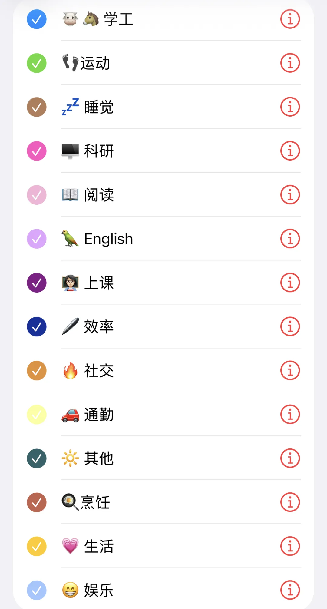 截止目前,我一共设置了14种类别。看过上一期的朋友应该可以猜到,“烹饪”是我新加的,在写这篇推送之前刚体验完做饭半小时、吃饭五分钟的生活hhhh。“通勤”也是新加的,因为找不到共享单车需要步行的时候,从宿舍走到济事楼得小20分钟,属于大项目,要单开一个。