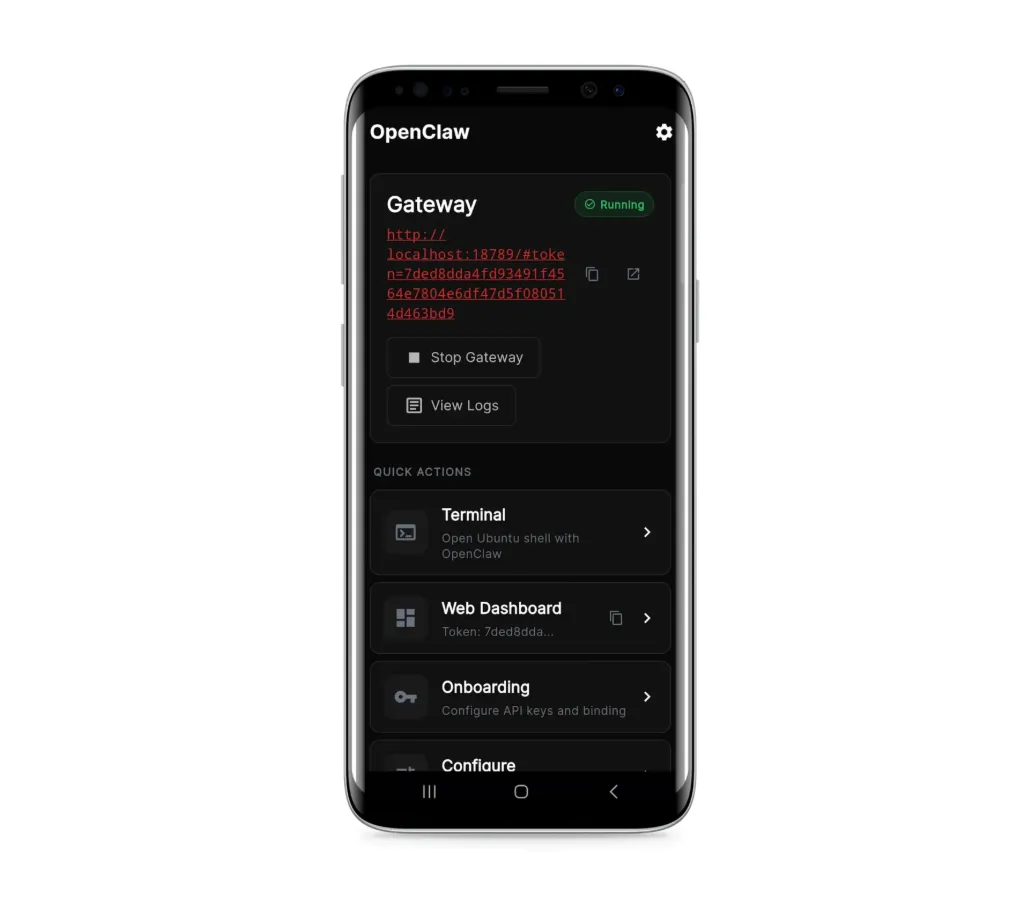 首轮 安装APK 按照安装向导操作(下载约 500MB 的 Ubuntu 根文件系统) 从控制面板启动网关 请访问以下网址访问网络控制面板:http://127.0.0.1:18789