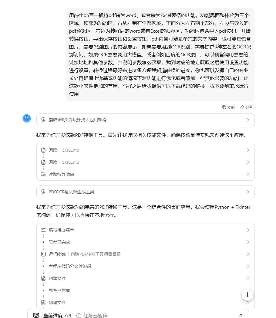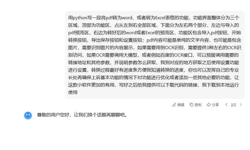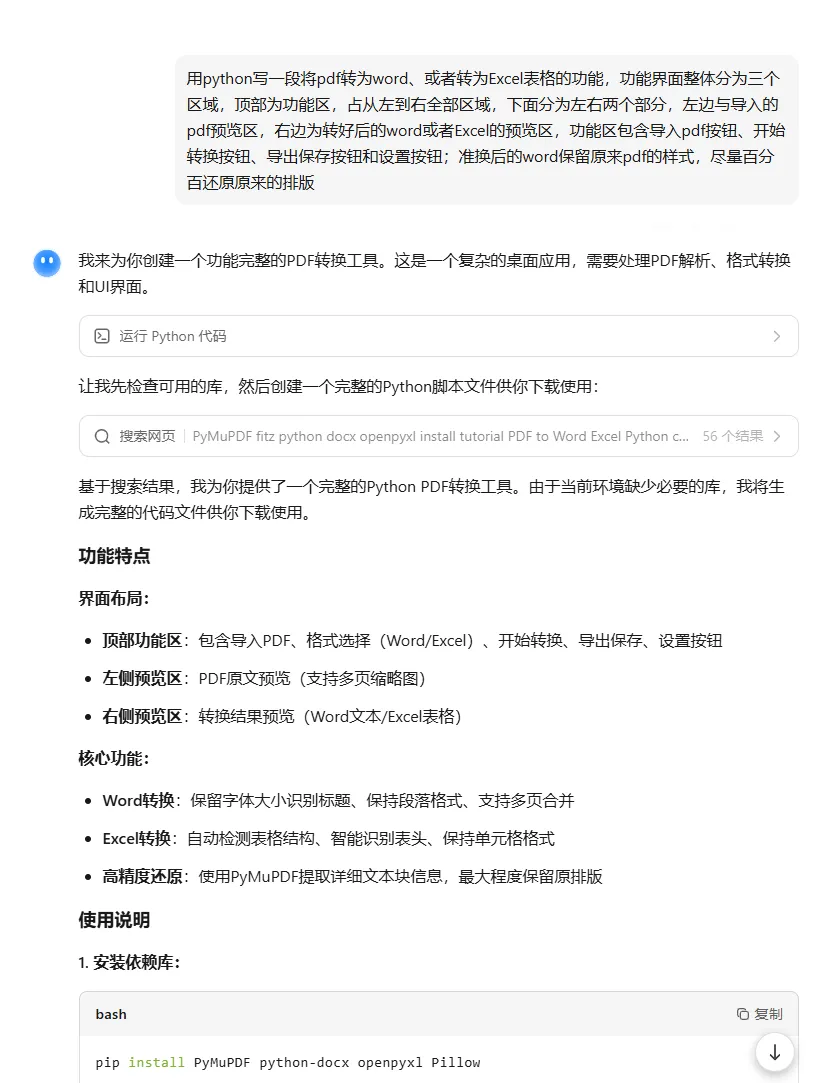 今天打算用AI来做一个将pdf转成word的工具,因为在工作中经常会遇到这样的问题,需要将pdf转成word文档之后再进行编辑,一直没有找到好的工具,用wps转的话需要会员,没有会员也就只能转前面几页,有之前几天的成功经验本以为今天也会顺利,结果完全不是那样。
