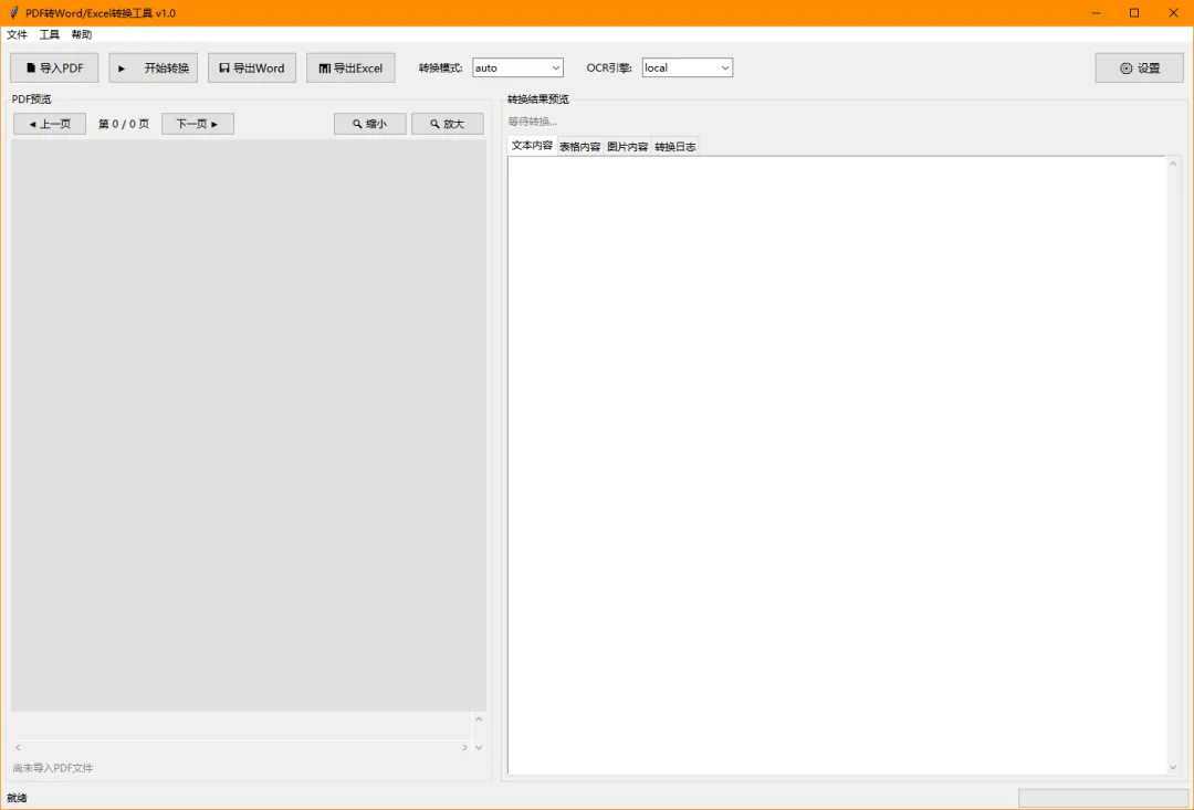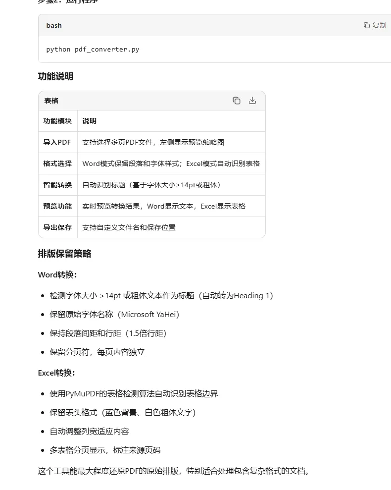 用python写一段将pdf转为word、或者转为Excel表格的功能,功能界面整体分为三个区域,顶部为功能区,占从左到右全部区域,下面分为左右两个部分,左边与导入的pdf预览区,右边为转好后的word或者Excel的预览区,功能区包含导入pdf按钮、开始转换按钮、导出保存按钮和设置按钮;pdf内容可能是单纯的文字内容,也可能是包含图片,需要识别图片的内容展示,如果需要用到OCR识别,需要提供3种左右的OCR识别访问,如果OCR需要调用大模型,或者例如百度的OCR接口,可以预留调用需要的链接地址和其他参数,并说明参数怎么获取,我到对应的地方获取之后使用设置功能进行设置,转换过程最好有进度条方便我知道转换的进度,你也可以发挥自己的专业长处再确保上诉基本功能的情况下对功能进行优化或者添加一些其他必要的功能,让这款小软件更加的有用,写好之后给我提供可以下载代码的链接,我下载到本地运行使用