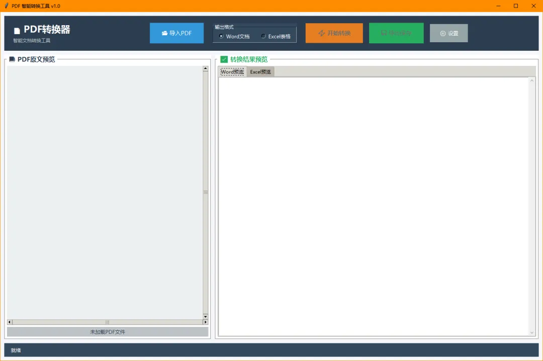用python写一段将pdf转为word、或者转为Excel表格的功能,功能界面整体分为三个区域,顶部为功能区,占从左到右全部区域,下面分为左右两个部分,左边与导入的pdf预览区,右边为转好后的word或者Excel的预览区,功能区包含导入pdf按钮、开始转换按钮、导出保存按钮和设置按钮;转换后的word保留原来pdf的样式,尽量百分百还原原来的排版。