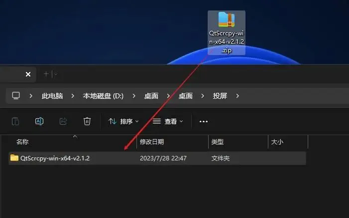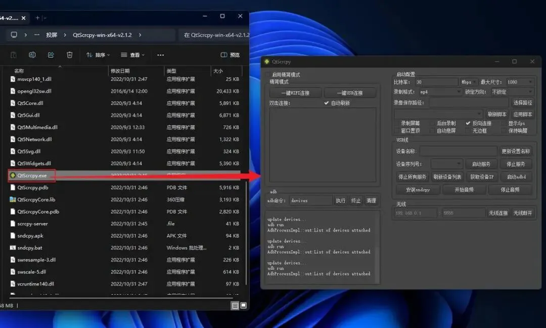 电脑端进入第一步解压后的QtScrcpy软件文件夹,双击QtScrcpy.exe,这样就把投屏软件打开了;