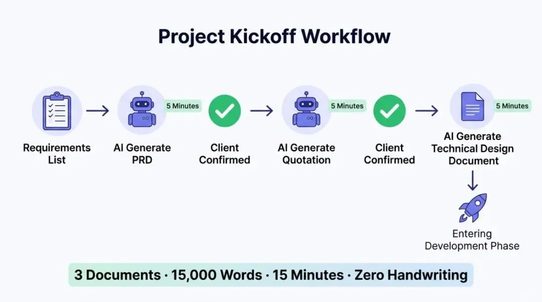 这次呢?5分钟出一份PRD,5分钟出一份报价单,5分钟出一份技术设计文档。