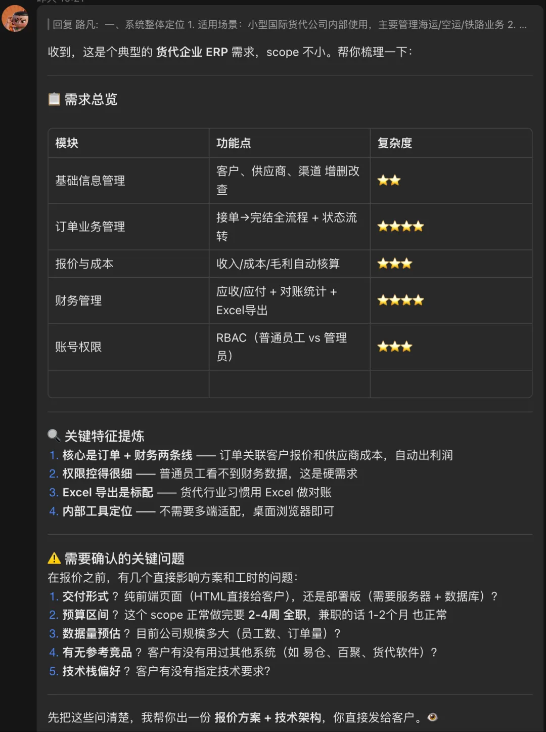 同样是大几千字,模块拆分、工时估算、分阶段报价、付款节点……一应俱全。
