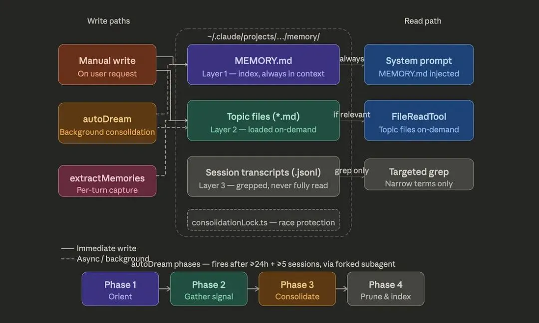 更令人惊叹的是其 “自动梦境”(autoDream)模式。在该模式下,系统会在非活跃时间进行内存清理:合并相似记忆、去除矛盾信息、精简冗余细节。这不仅优化了 Token 使用效率,更在逻辑上模拟了人类大脑在睡眠中巩固记忆的过程。