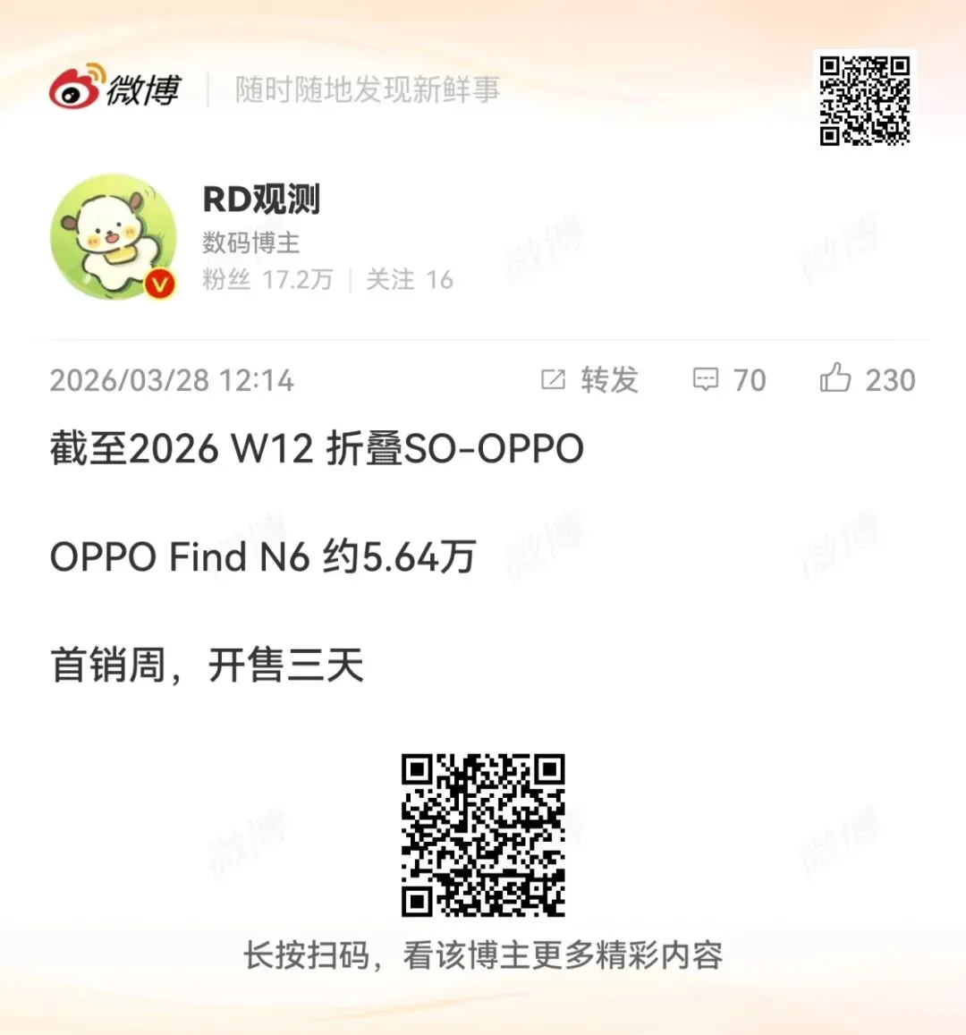 从结果看,市场已经给出了相当直接的回应。Find N6开售三天卖了5.64万台,放在同期折叠品类里是卖得最好的。再往后看,它还冲进了第十二周全国销量前三十,而且是这个榜单里唯一一台国产万元产品。这不是简单一句“卖得不错”能概括的成绩,而是说明它已经不只是折叠圈子里的热闹产品,而是真正在更大的消费市场里拿到了一席之地。