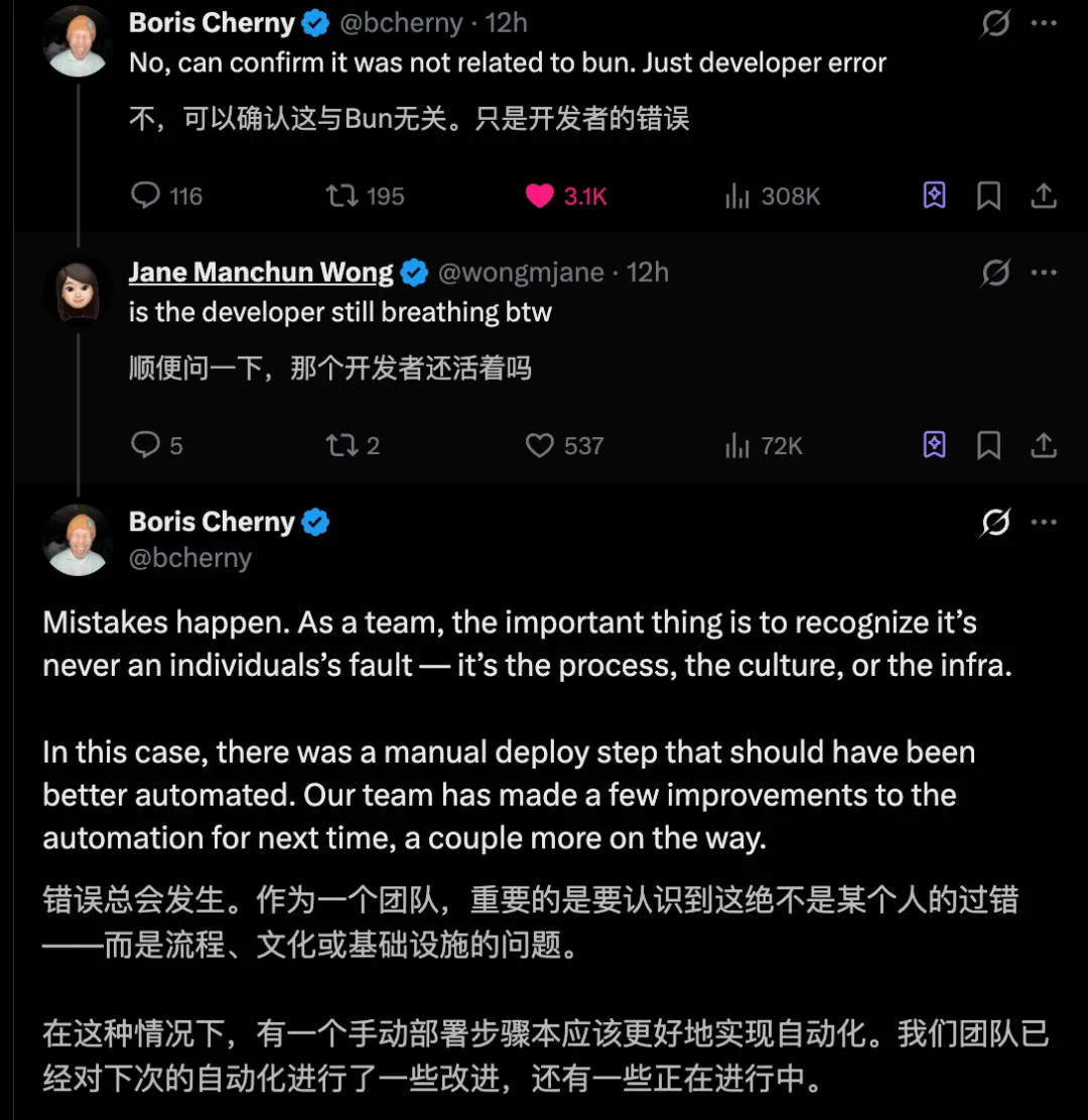 Anthropic Claude Code 的打造者、工程负责人 Boris Cherny,当被问到是Bun的错,还是开发者的错误时,他给了一个「半官方」的回应: