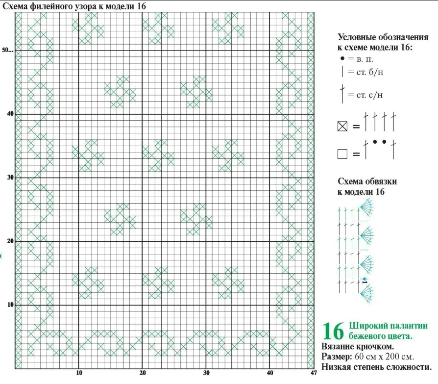 第1行:在从钩针数起的第9个锁针上钩1个长针,* 2个锁针,在从钩针数起的第3个基础锁针上钩1个长针 *,从 * 到 * 重复45次,共计47个网眼方格。接着按照网眼编织花样图解,以正反行继续网眼编织,直至所需长度。