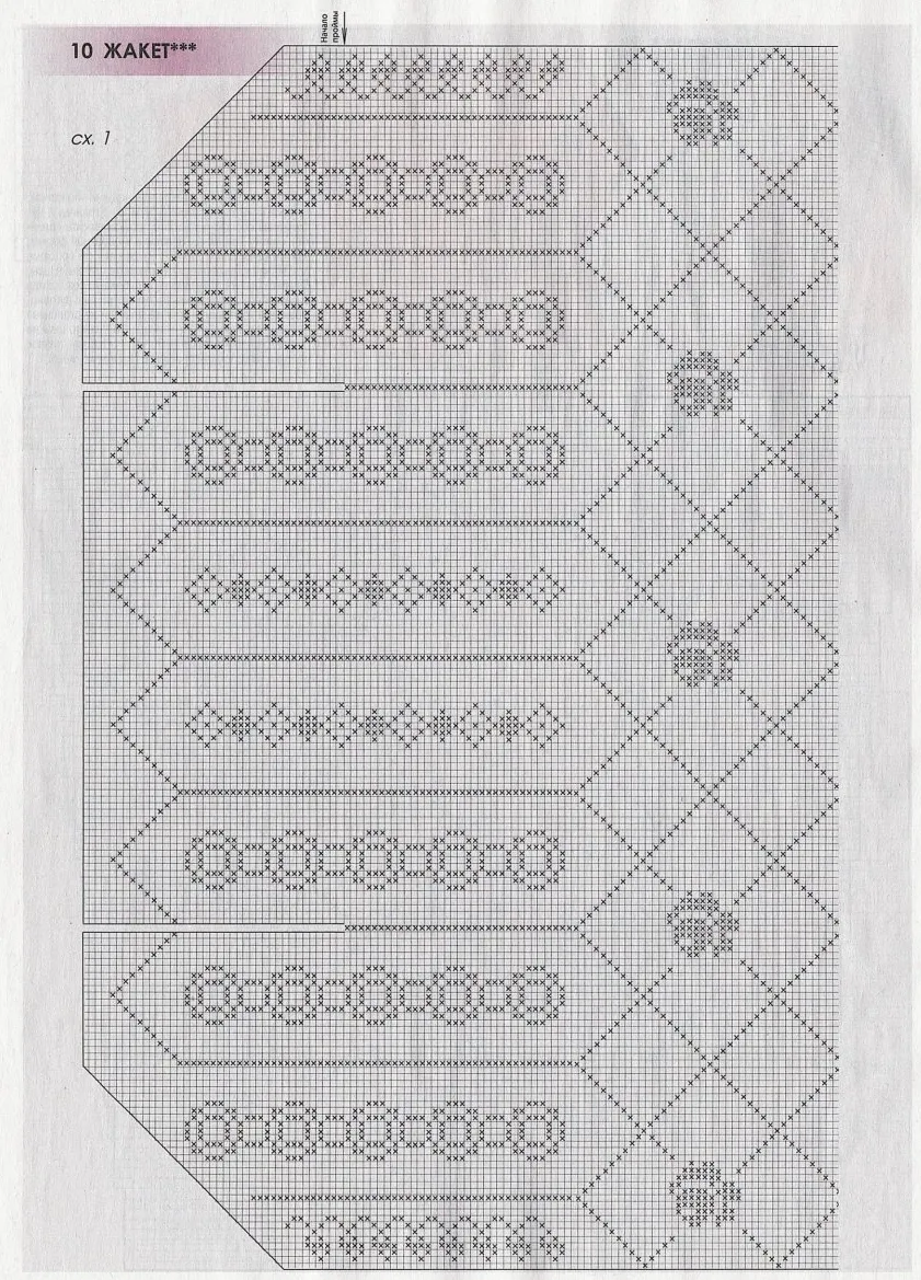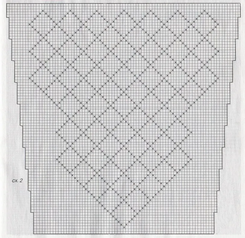 前片与后片连成一片织造,按照图解1(见下页)编织(共181个网眼方格)。织到袖窿高度时,将前片和后片分开编织。领口为V形,按45°角编织网眼。袖子按照图解2编织(共67个网眼方格)。缝合肩缝。