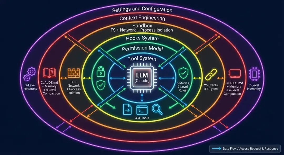 图 0-1: Harness Engineering 架构全景 — LLM 被六层 Harness 基础设施环绕:工具系统(43+)、权限模型(5 种模式)、Hooks 系统(26 事件 x 4 类型)、沙盒(文件+网络+进程隔离)、上下文工程(CLAUDE.md + 记忆 + 四级压缩)、设置与配置(7 级层级)。