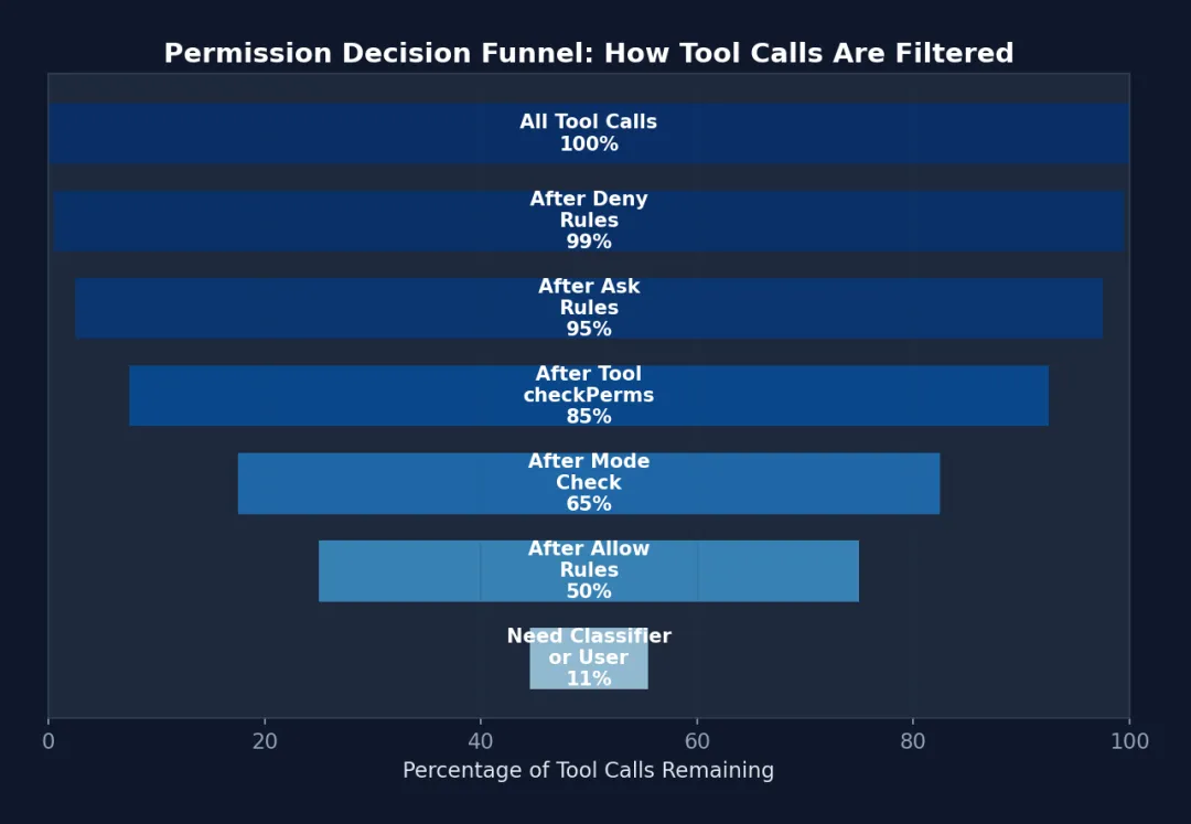 2. 约束是力量,不是限制。 每添加一条精确的权限规则,你就能放心让 Agent 做更多事情。纵深防御的六层让 Claude Code 敢于在生产环境中运行 rm、git push这样的危险命令——因为每一层都在守护。 -