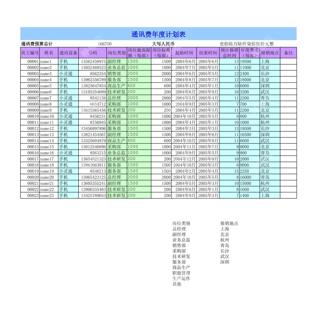 本文档是一份企业员工年度通讯费的统计计划表,旨在帮助企业行政、财务人员高效梳理员工通讯费预算与报销明细。文档详细统计了23名不同岗位员工的通讯费信息,包含员工岗位类别、通讯设备类型、年度费用标准及报销地点等核心内容,还明确了各岗位的通讯费最高限额与报销周期,让管理人员能够清晰掌握企业通讯费整体预算与分布情况。无论你是企业财务人员还是行政管理人员,这份文档都能为你提供精准的通讯费数据支撑,助你高效完成费用核算与预算管理。