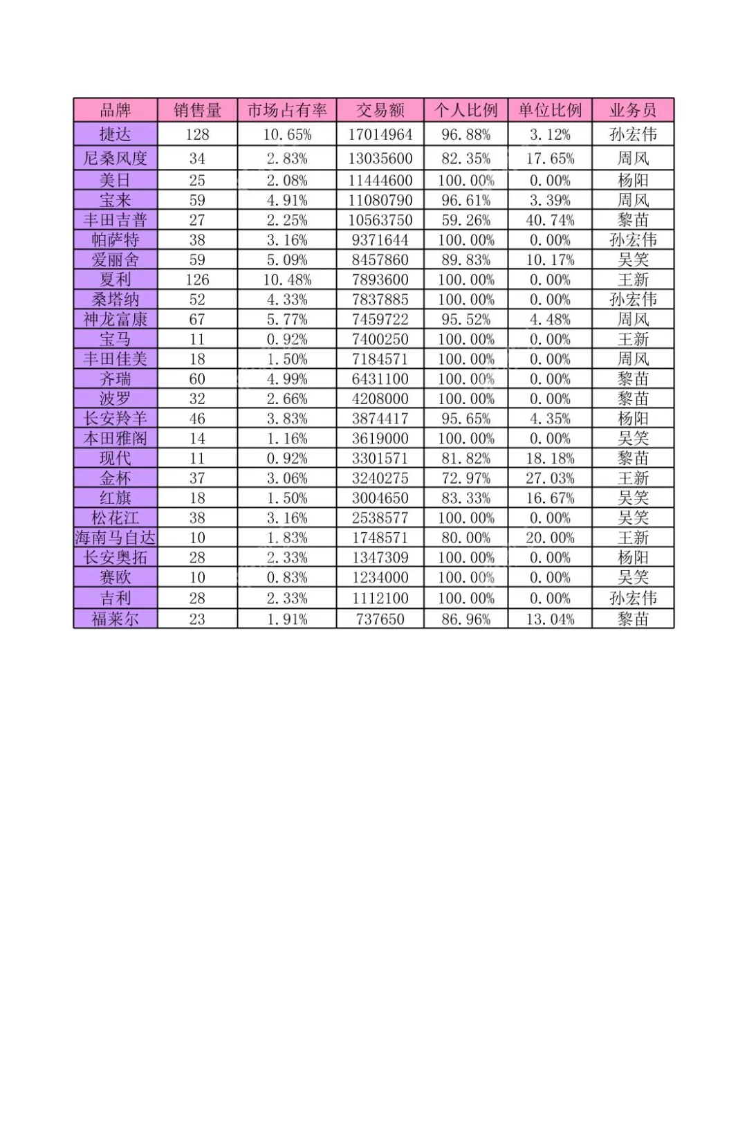 本文档是一份汽车销售数据统计报表,为汽车销售从业者、市场分析人员提供精准的销售数据参考。报表涵盖捷达、尼桑风度等25个汽车品牌的核心销售数据,详细呈现了各品牌销售量、市场占有率、交易额等关键指标,同时标注了个人与单位客户的购买比例及对应负责业务员。通过清晰的结构化数据,读者可快速掌握各品牌销售表现、客户结构分布,还能对应到具体业务负责人。无论你是销售管理者还是市场分析人员,这份报表都能为你提供决策支撑,助力优化销售策略。