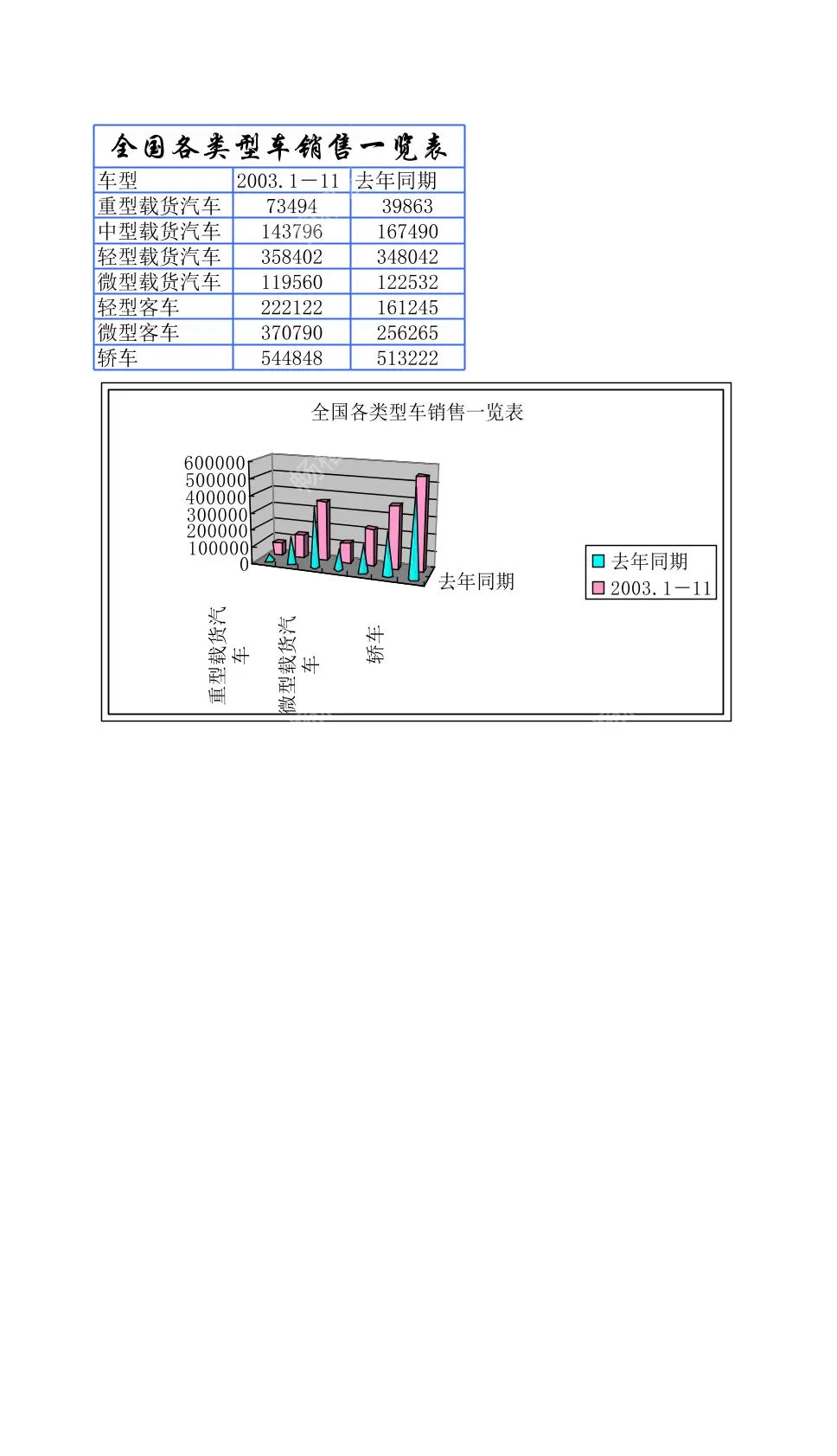 本文档是一份2003年全国各类型车辆的销售数据对比表,为汽车行业从业者、市场分析人员提供精准的销量参考。文档详细列出了重型载货汽车、中型载货汽车、轻型客车等7类车型2003年1-11月的销量,同时对比呈现了各车型的去年同期销量数据,清晰展现不同车型的市场销量变化趋势。无论你是汽车行业研究者、车企营销人员还是市场分析从业者,这份数据表格都能为你提供直观的销量对比信息,助你把握汽车市场的销量动态。
