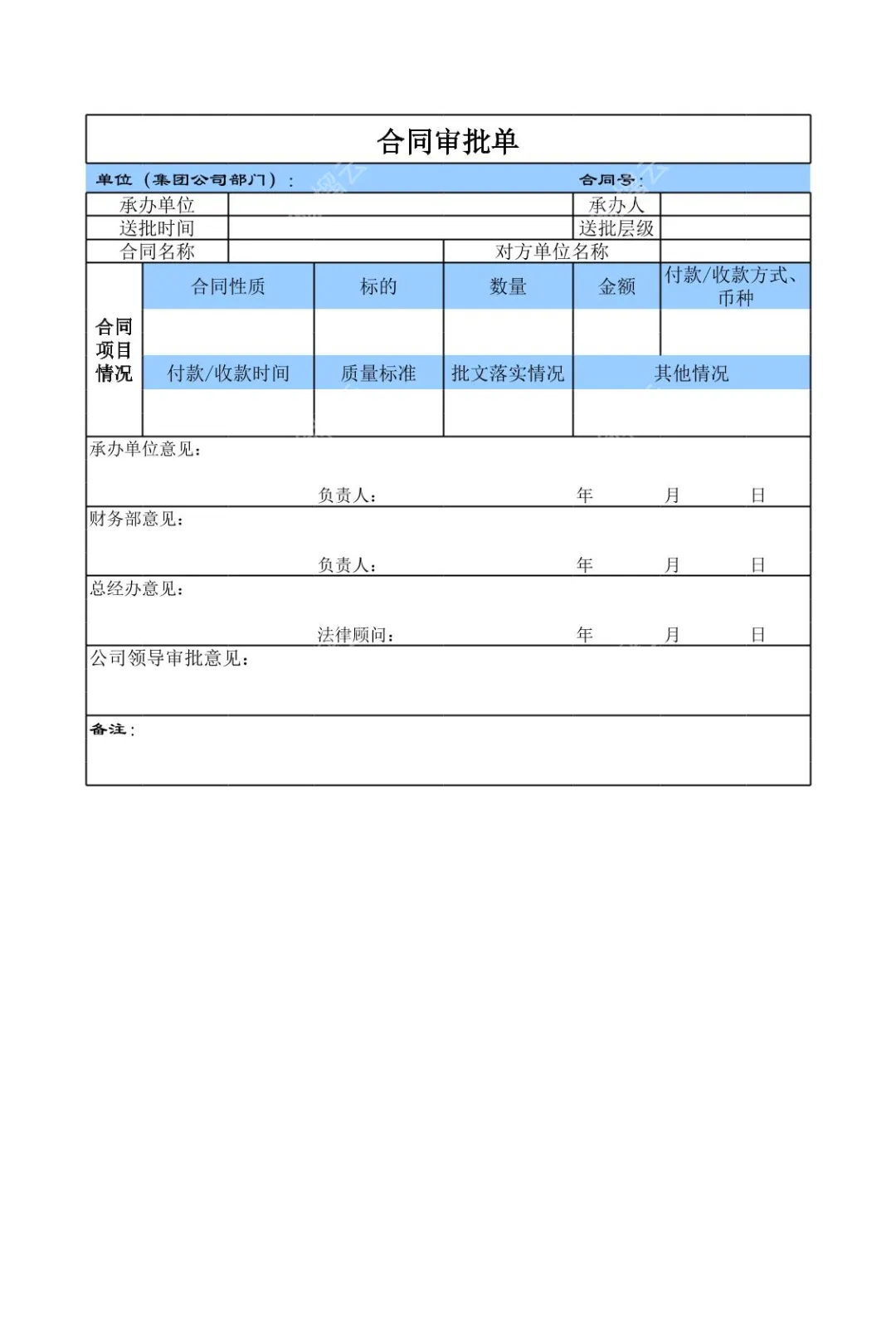 本文档是一份规范的合同审批单模板,为企业合同审批流程提供标准化的填报与审批框架。模板涵盖了合同基础信息栏,可填写合同号、对方单位、标的、金额等核心内容;还设置了合同项目详情板块,包含付款/收款方式、质量标准、批文落实情况等关键信息;同时配备了完整的审批意见栏,覆盖承办单位、财务部、总经办及公司领导的审批签署区域。无论你是企业行政人员、合同专员还是部门负责人,这份模板都能帮你规范合同审批流程,提升合同管理的规范性与效率。