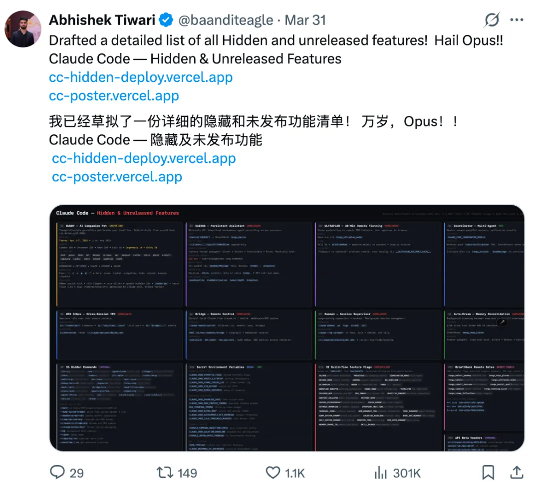 当然,除了大家都在猛猛上课学习之外,还有人从这次报曝光的代码结构里,扒出了不少 Anthropic 的小秘密。