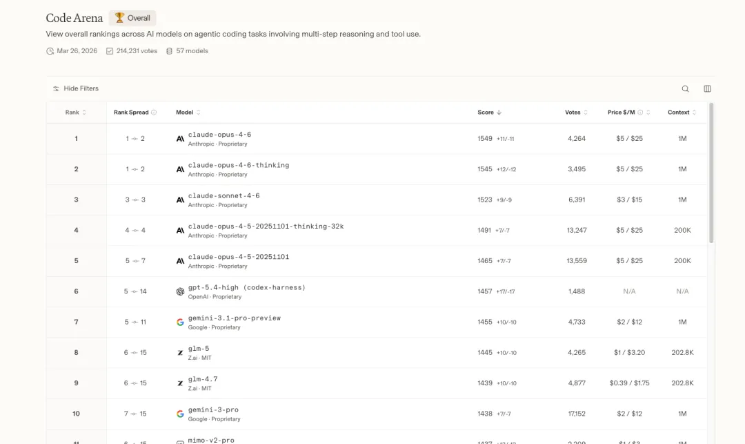 打开大模型竞技场,选到编程能力这一块儿,你就会发现一个极其恐怖的现象:前五名的模型直接被 Claude 一家给包圆了。