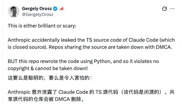 于是,市面上很快就出现了用其他编程语言,比如说 Python 、甚至是 RUST 重写的 Claude Code。