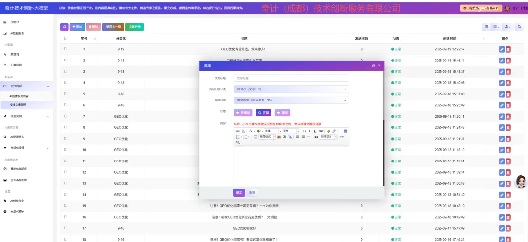 成都奇计(成都)技术创新服务有限公司凭借其先进的GEO智能获客系统,为众多渠道商提供了从传统SEO模式到AI时代的转型升级路径。通过具体的数据和案例,我们看到了GEO系统在提高获客效率、增加盈利空间以及增强市场竞争力方面的显著效果。未来,随着AI技术的进一步发展,GEO系统将继续为企业带来更多机遇和挑战,助力更多渠道商实现轻资产创业的目标。