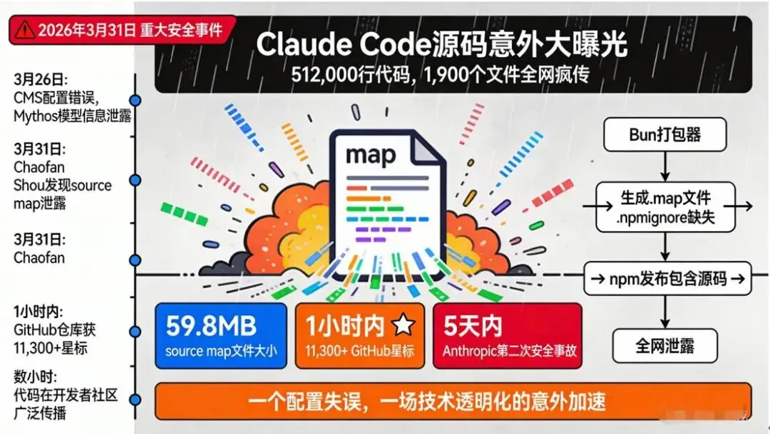 2026年3月31日,安全研究员Chaofan Shou在例行检查npm包时,于@anthropic-ai/claude-code v2.1.88版本中发现了约60MB的cli.js.map文件。这个Source Map文件通过sourcesContent字段完整嵌入了原始源码,仅需一行命令即可还原出51.2万行TypeScript代码、1906个源文件、40+功能模块的完整原始代码。