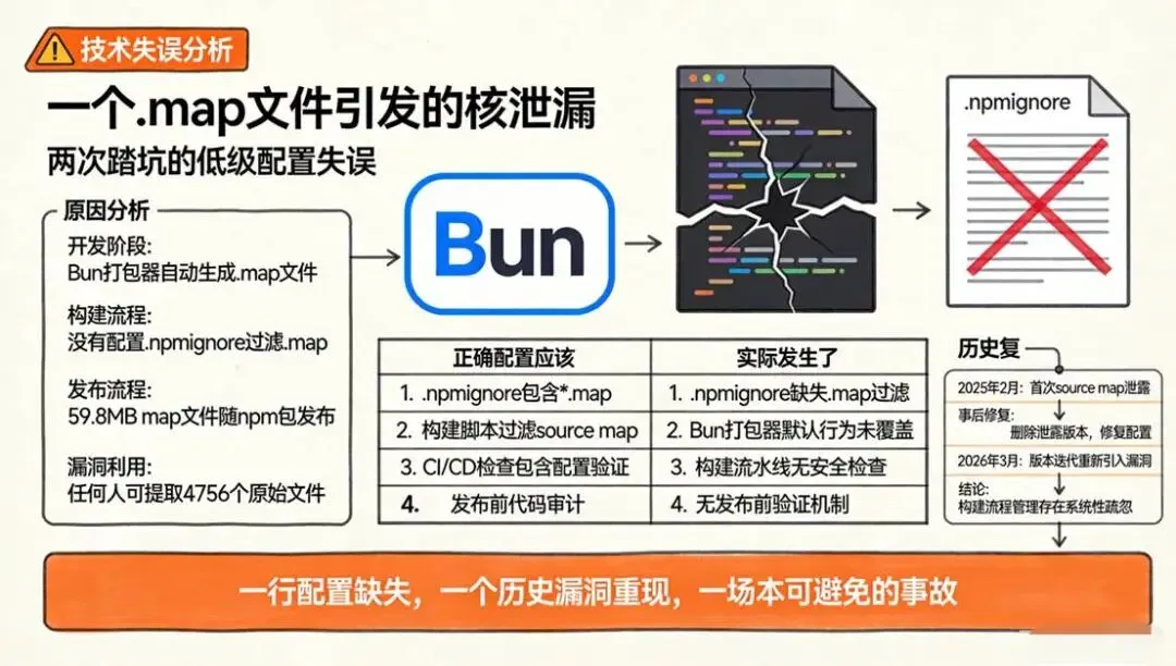 此次泄露的技术原因简单到令人哭笑不得:构建配置疏漏导致Source Map文件被意外包含在生产包中。Claude Code使用Bun作为打包工具,Bun的打包器默认生成Source Map,除非显式关掉。这次泄露的直接原因,据社区分析,大概率是构建流水线里没有做好.map文件的清理,发布时把一个59.8 MB的source map文件一起发到了npm registry。