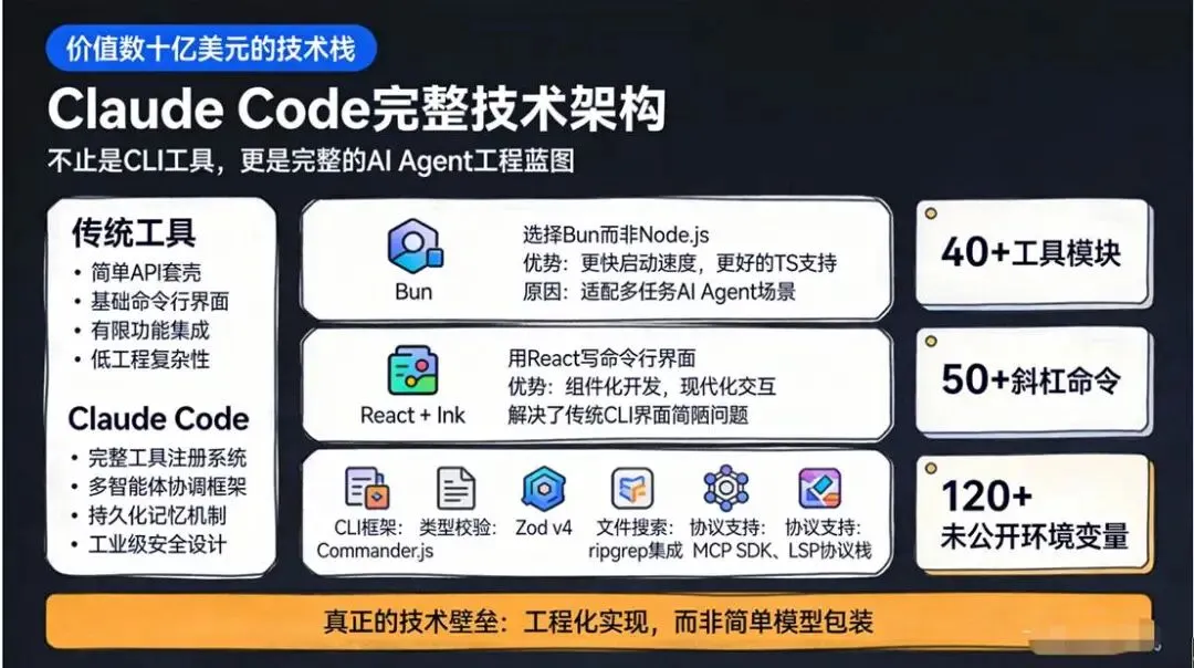 泄露代码打破了“Claude Code仅是终端版Claude”的认知,其技术架构体现了Anthropic对“AI工程师”的终极理解。技术选型围绕AI Agent落地优化:选用Bun替代Node.js以提升启动速度、TypeScript支持及包管理效率;采用React + Ink构建终端UI,兼顾组件化优势与现代化交互。